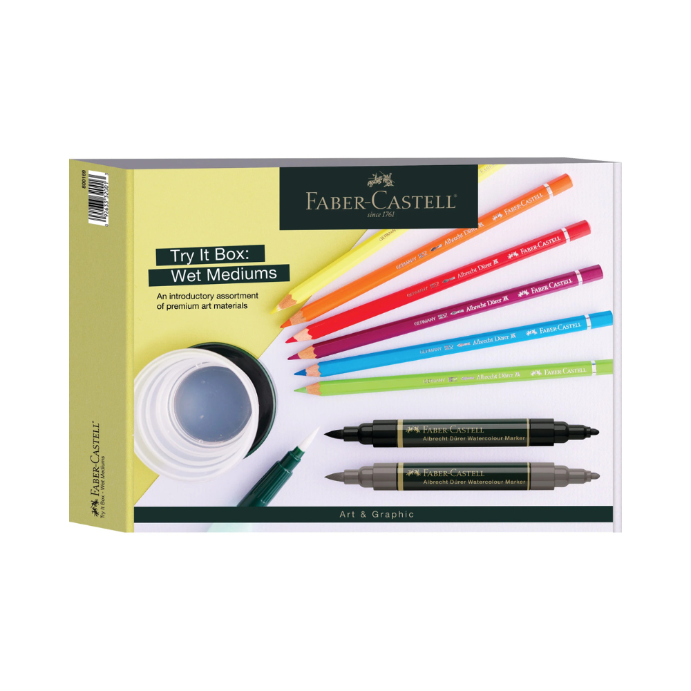 A trial assortment of premium quality art materials including instructions for the beginner hobby artist. Try It Box: Wet Mediums includes - 6 Albrecht Dürer Watercolor Pencils #105 Light Cadmium Yellow, #115 Dark Cadmium Orange, #219 Deep Scarlet Red, #171 Light Green, #110 Phthalo Blue and #133 Magenta, 2 Albrecht Dürer Watercolor Markers #273 Warm Grey IV and #199 Black, 1 Water brush, 1 Water cup, 1 Blending palette and Info guide.