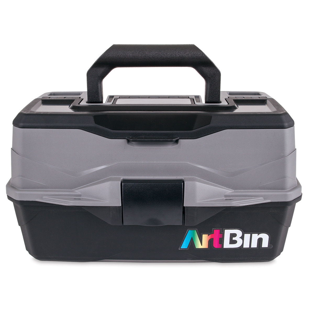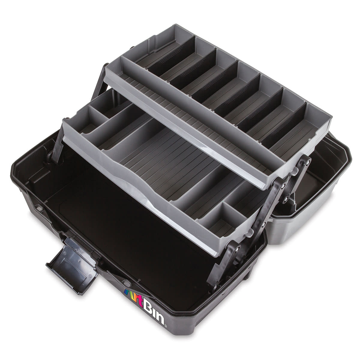 This black and gray storage box features two cantilevered trays with ArtBin’s Tip-Guard design to prevents spills. Customize the trays by utilizing the removable dividers to form up to 15 compartments which allow for the storage of longer items including brushes, pencils, and other tools. The bottom bin offers ample storage for larger, bulkier items, and the lid contains a quick access area for smaller pieces such as sharpeners and erasers. The recessed handle, draw-tight latch, and tongue-and-groove construction create a sturdy container designed for both storage and portability. The main bin has the potential to be secured with padlocks.