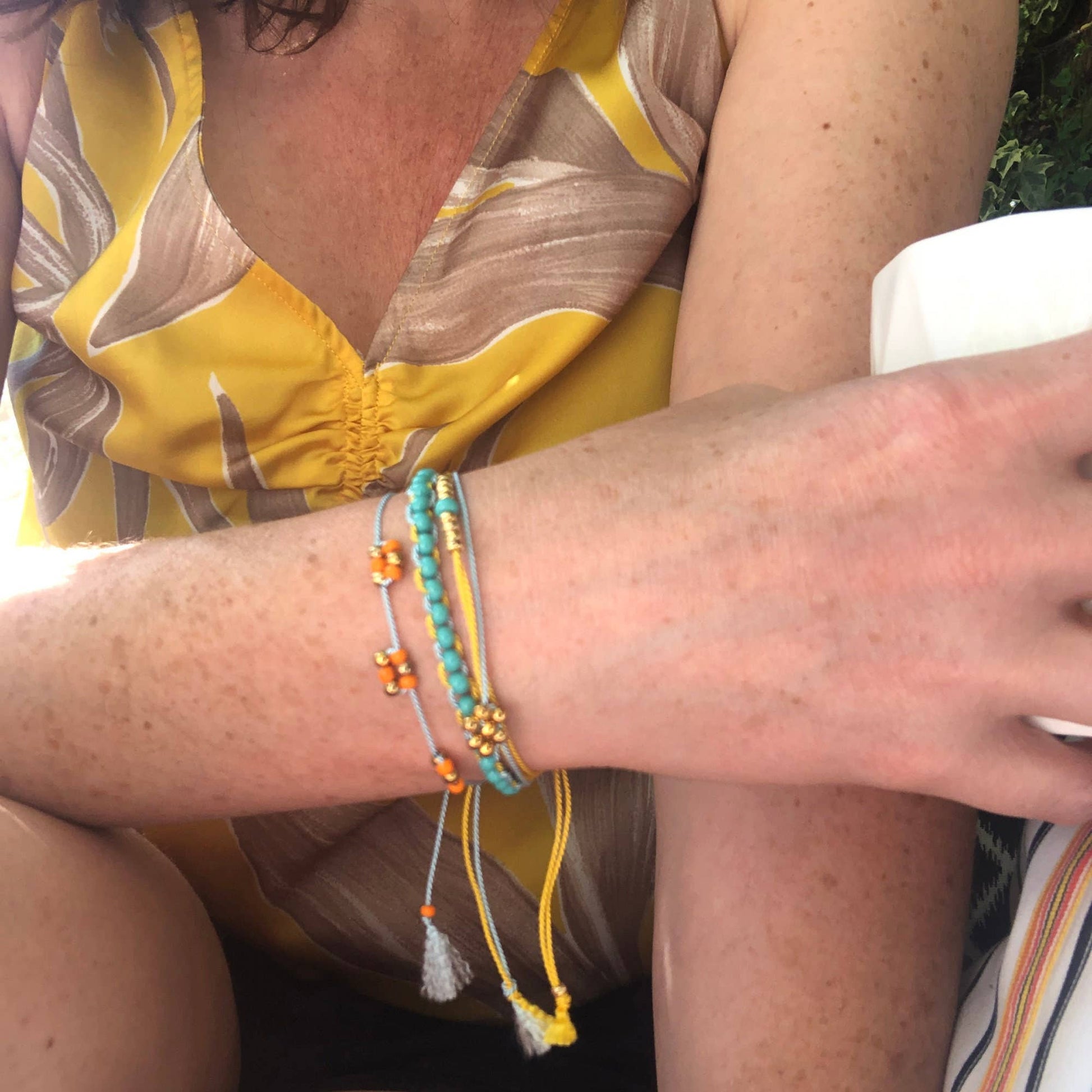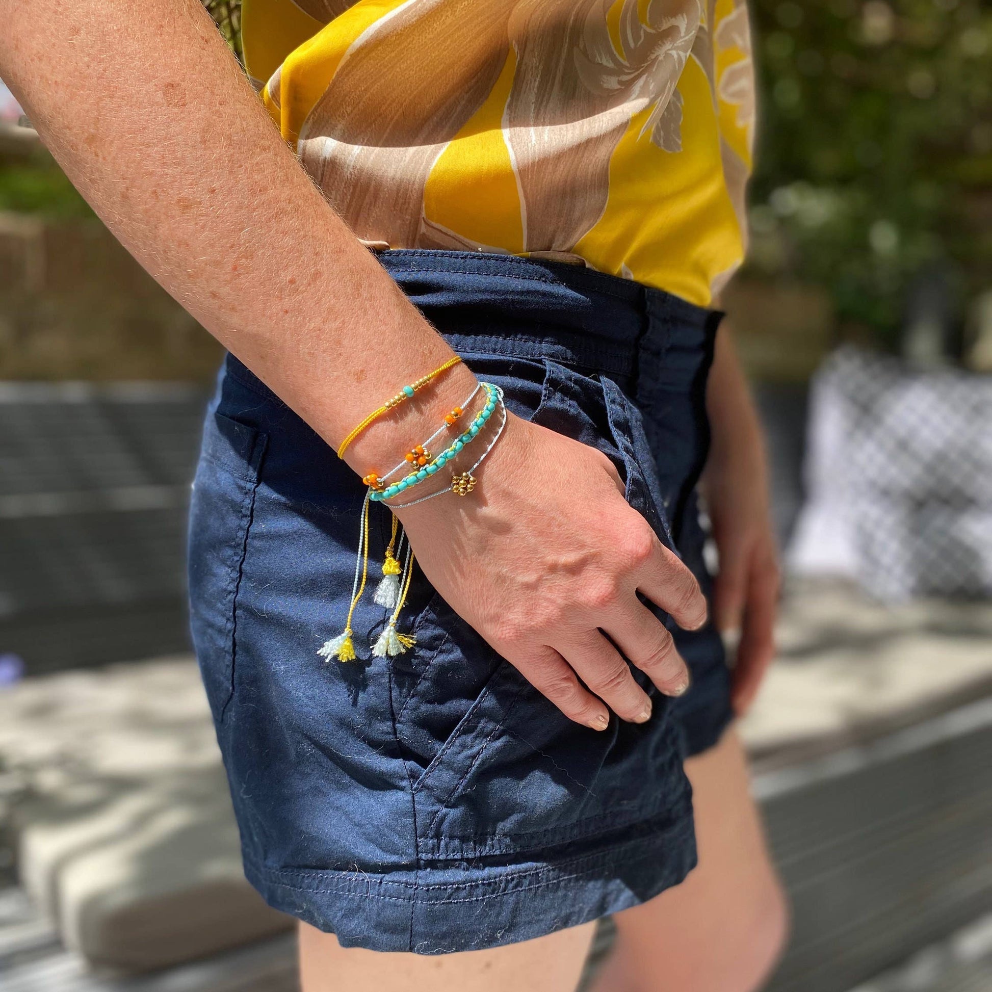 Make your own boho beaded bracelets with this jewelry making kit, the perfect craft gift for her. We have created four simple beading designs, which are perfect for beginners to jewelry making. Thread together colorful silks, metallic beads and pretty seed beads into a set of DIY bracelets that stack together and look gorgeous on the beach or at a festival. The techniques learned in this kit can be used over and over again. Our beading tutorials are designed and lovingly hand made in our Hertfordshire studio. We source premium materials and pack them into a ready-to-gift display box with everything you need inside. Open the box to discover two beading silks with built-in fine needles. Plus a collection of brass-plated beads and colorful seed beads in two different sizes. The kit includes full step-by-step, photographic instructions. You will also need a pair of scissors and an iron. This is not a toy. Anyone under the age of 14 should be supervised by an adult.