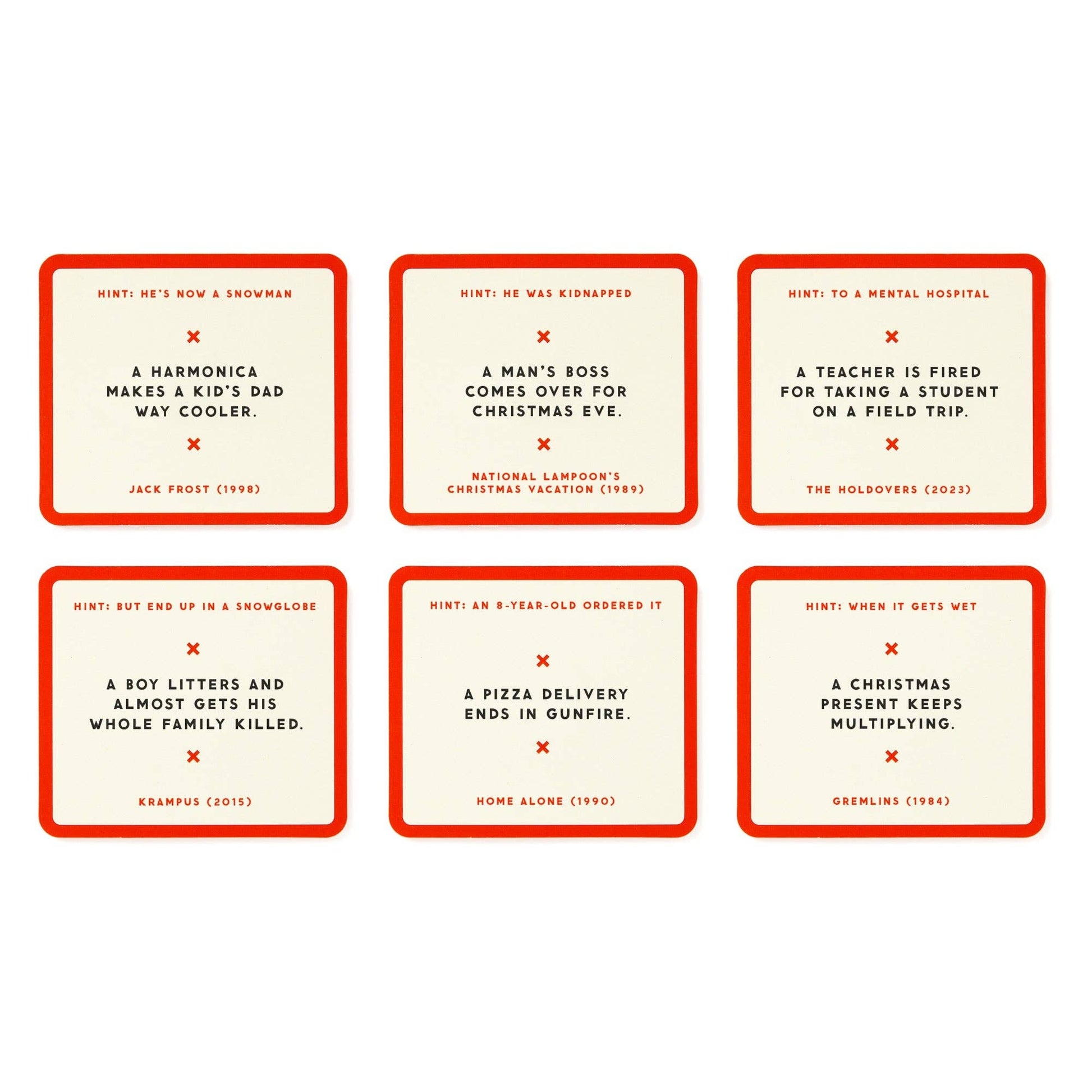 A party game all about identifying movies–from the worst descriptions humanly possible. Features 125 game cards–each featuring a uniquely-terrible description of a holiday movie. Includes instructions for two distinct ways to play (competitive & casual). Suitable for 2 to 8 players. Enjoy the game on the go or expand your original edition!