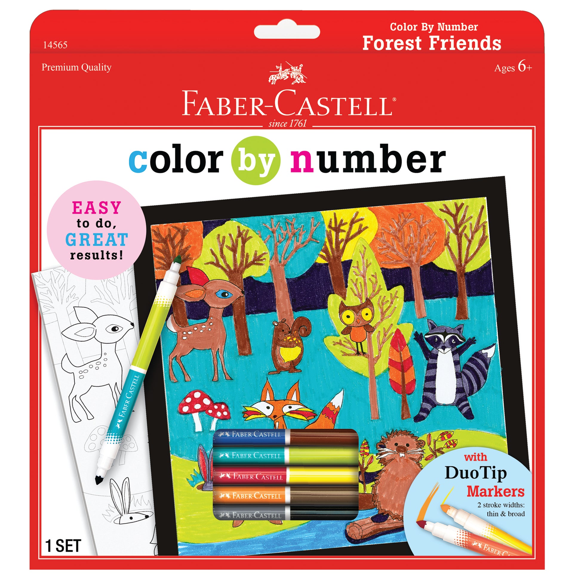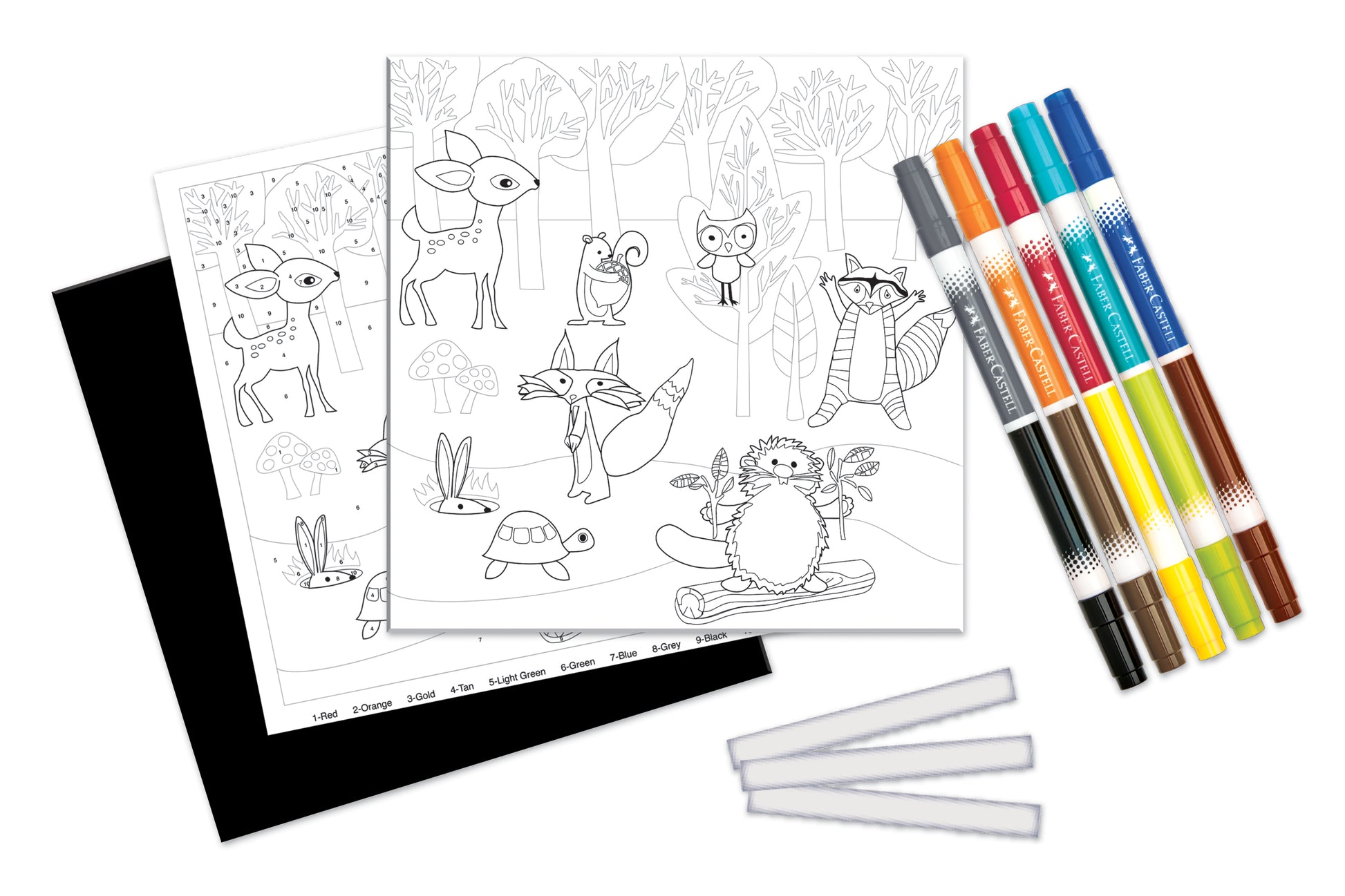 Kids will LOVE to color this color by number fun and furry forest friends artwork and hang it on their wall. This guided art activity will appeal to kids who are interested in art and want to create a "masterpiece". The numbered color guide is printed separately from the canvas to allow young artists to follow the guide or color the picture in their own creative way. The brightly colored Faber-Castell Duo Tip Markers have a ventilated safety cap to prevent choking. The water-based inks wash out of most fabrics. The pen tips allow you to achieve 2 line widths: thin and broad.