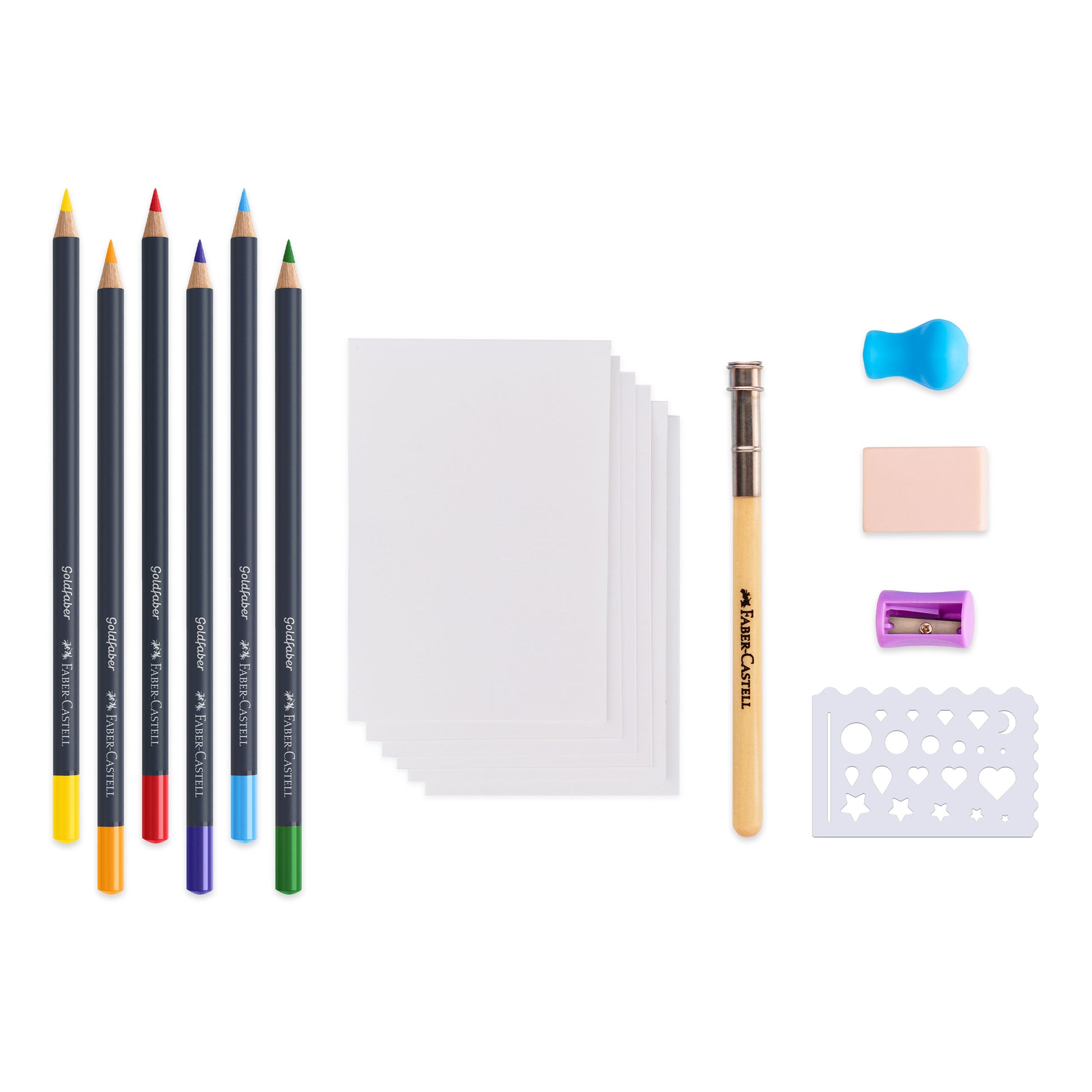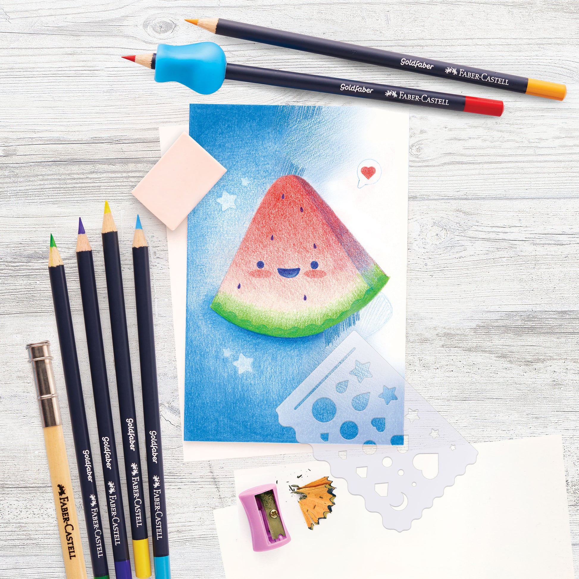 Learn basic color pencil techniques with this set by Creative Studio. | This set includes 6 Goldfaber Color Pencils, 6 Sheets of Sketching Paper, a Pencil Extender, Pencil Grip, Soft Eraser and Sharpener and Eraser Shield. | Includes guides instructions sheet with tips and techniques for drawing with color pencils and step by step instructions for a cute watermelon drawing.