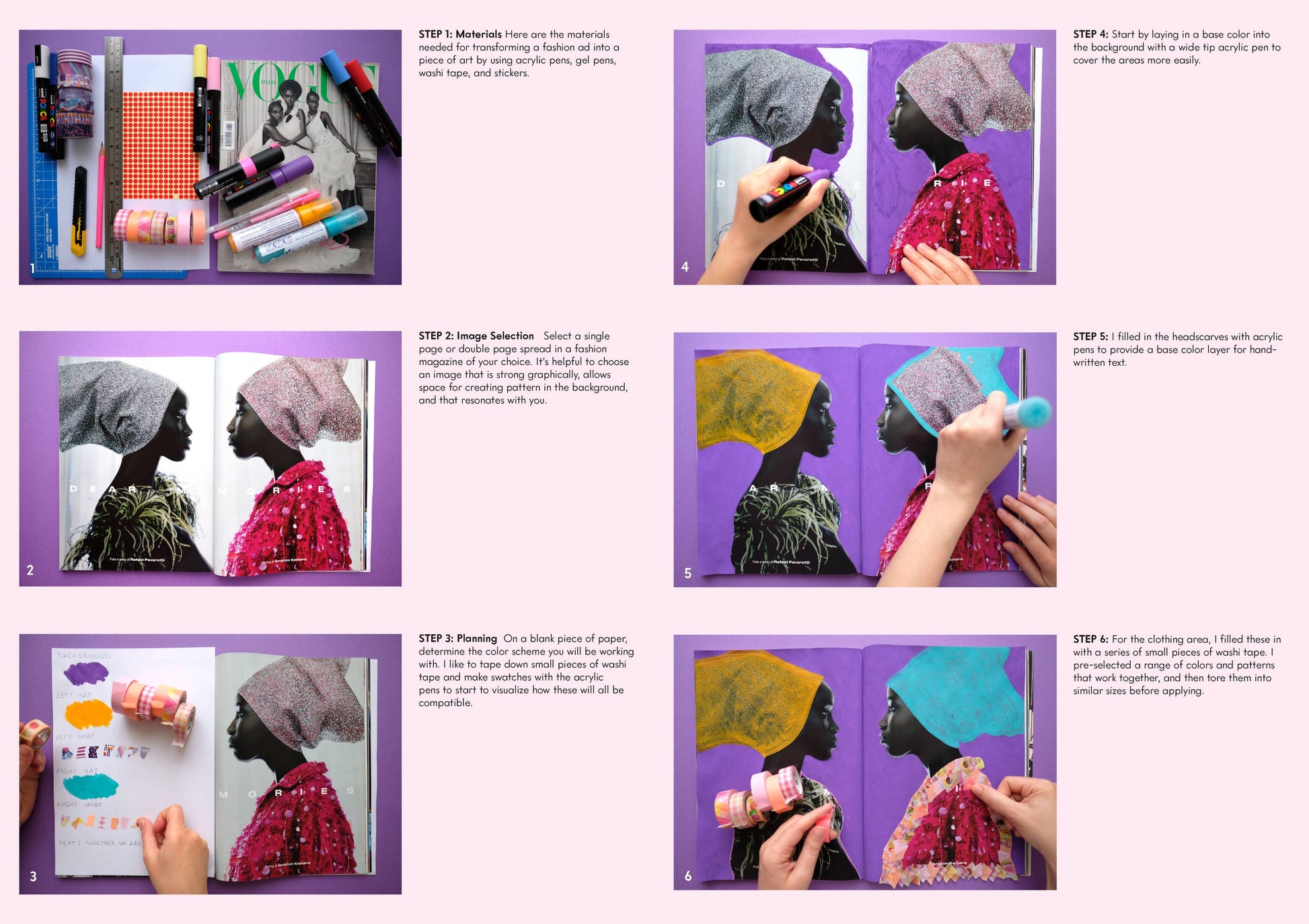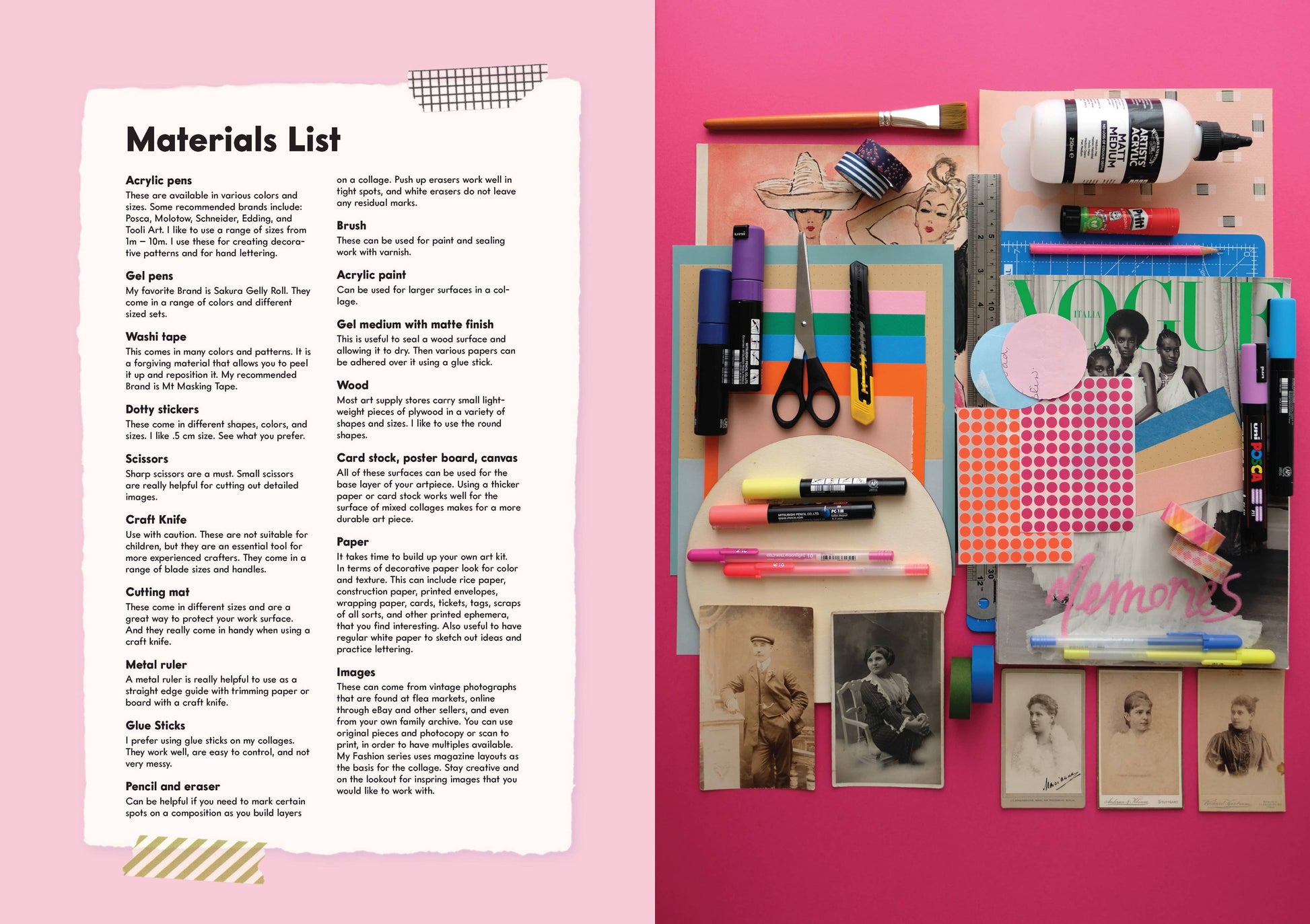 * Materials, techniques, and tools, from what types of acrylic paint pens she uses to the specific Washi tape she favors to how to explore pattern and color palettes through layering and hand-lettering.