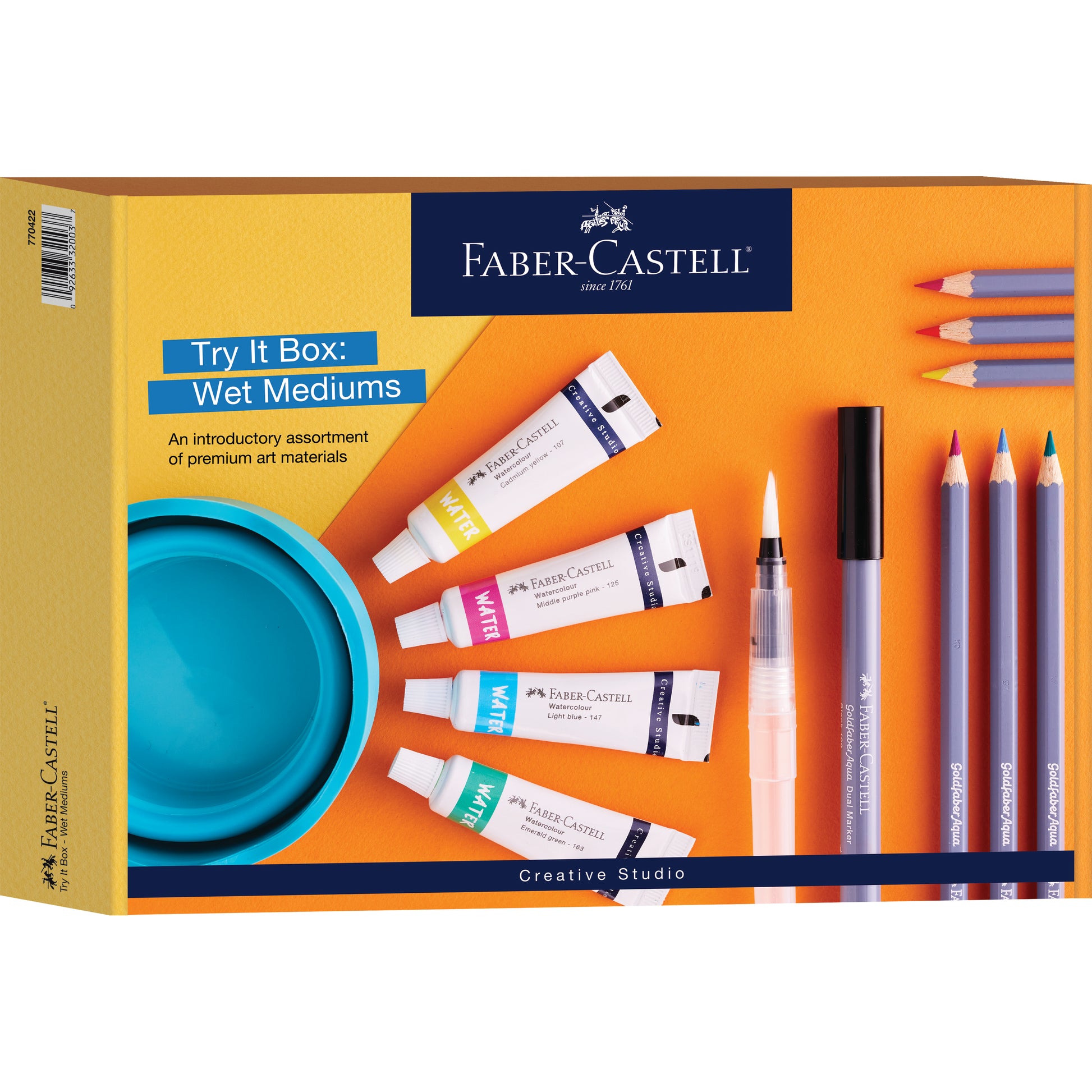 Discover the unparalleled excellence of Faber-Castell Creative Studio art materials. Packed with a curated selection of top-notch artist essentials, each box delivers exceptional value for your artistic journey. Elevate your creative experience with a variety of artist mediums, including Color Pencils, Watercolors, Pastels, Graphite pencils, and more—all in one convenient purchase. And here's the exciting part – we've included helpful tips and techniques to guide you along the way. Whether you're a seasoned artist or just starting, these boxes are designed to inspire and support your artistic endeavors. Immerse yourself in the world of Faber-Castell quality and let your creativity flourish! Try It Box: Wet Mediums includes 6 Goldfaber Aqua Watercolor Pencils, Goldfaber Aqua Dual Ended Marker, Clic and Go Water Cup, 4 Watercolor Paints 9ml/ea, Waterbrush and Instructions.