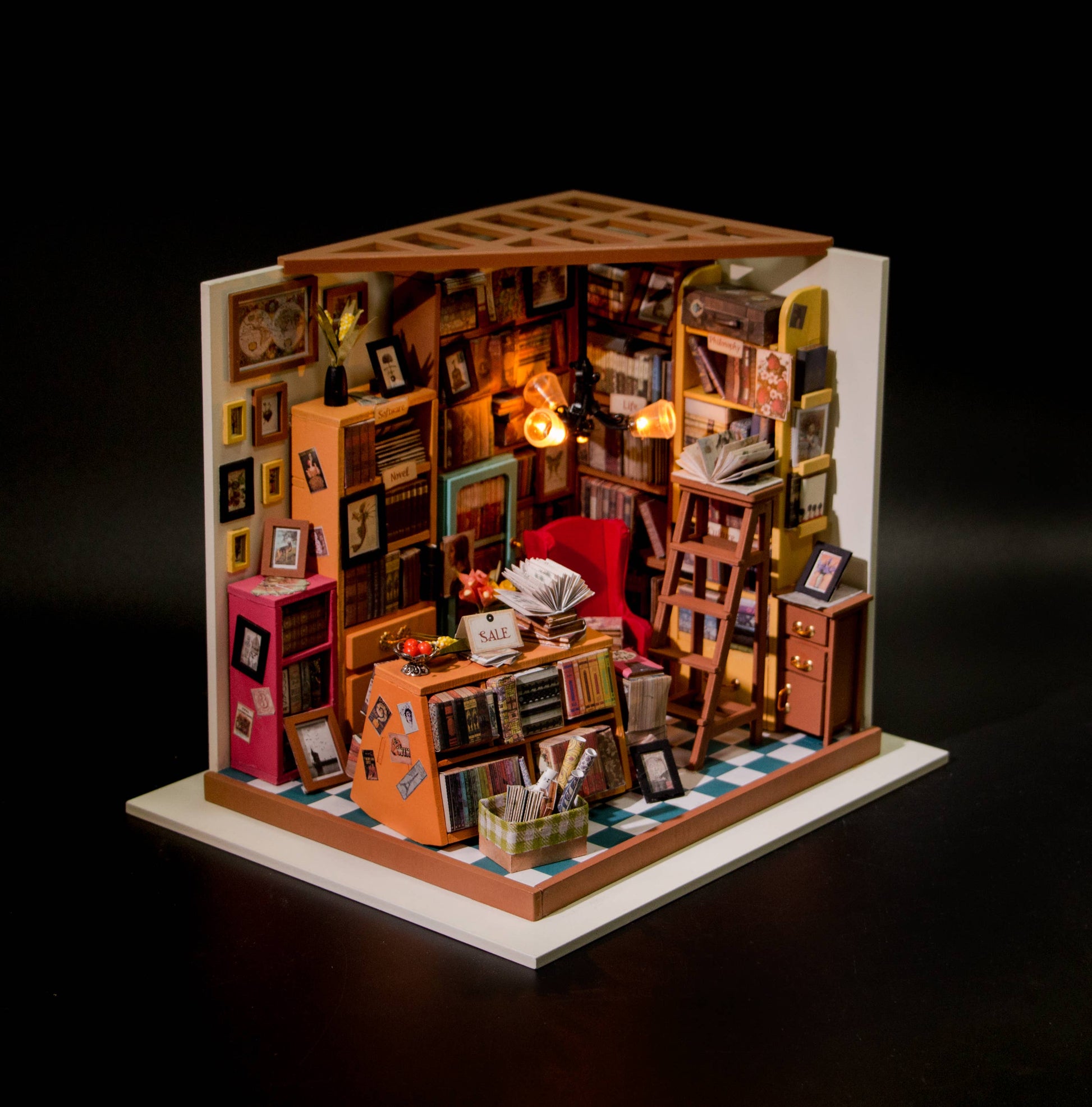 Robotime-Rolife Sam's Study DG102 is a classic style library mini dollhouse. Full of realistic details like crowded shelves and cabinets, realistic books and magazines, photos and frames, etc. You'll definitely feel amazing and sense of fulfillment after finished.