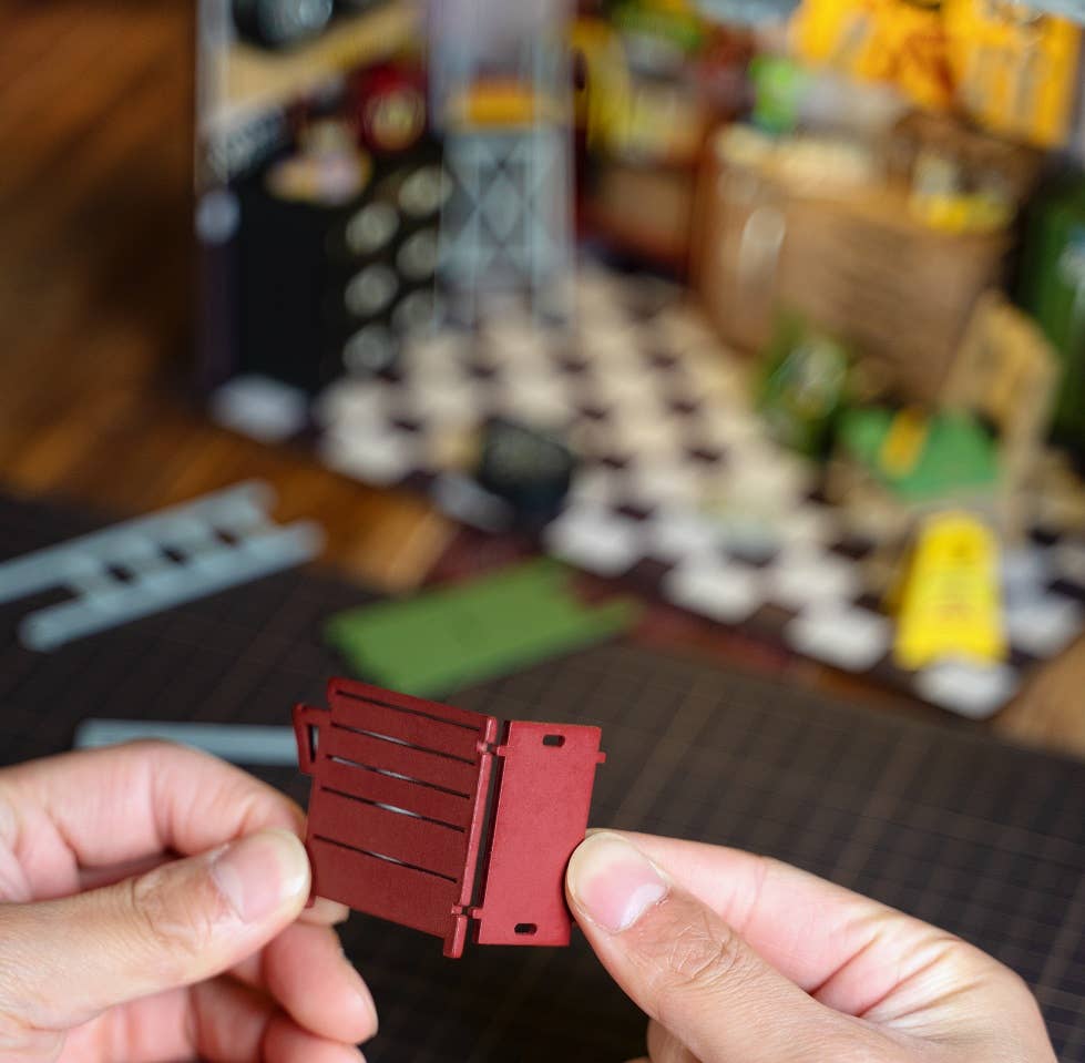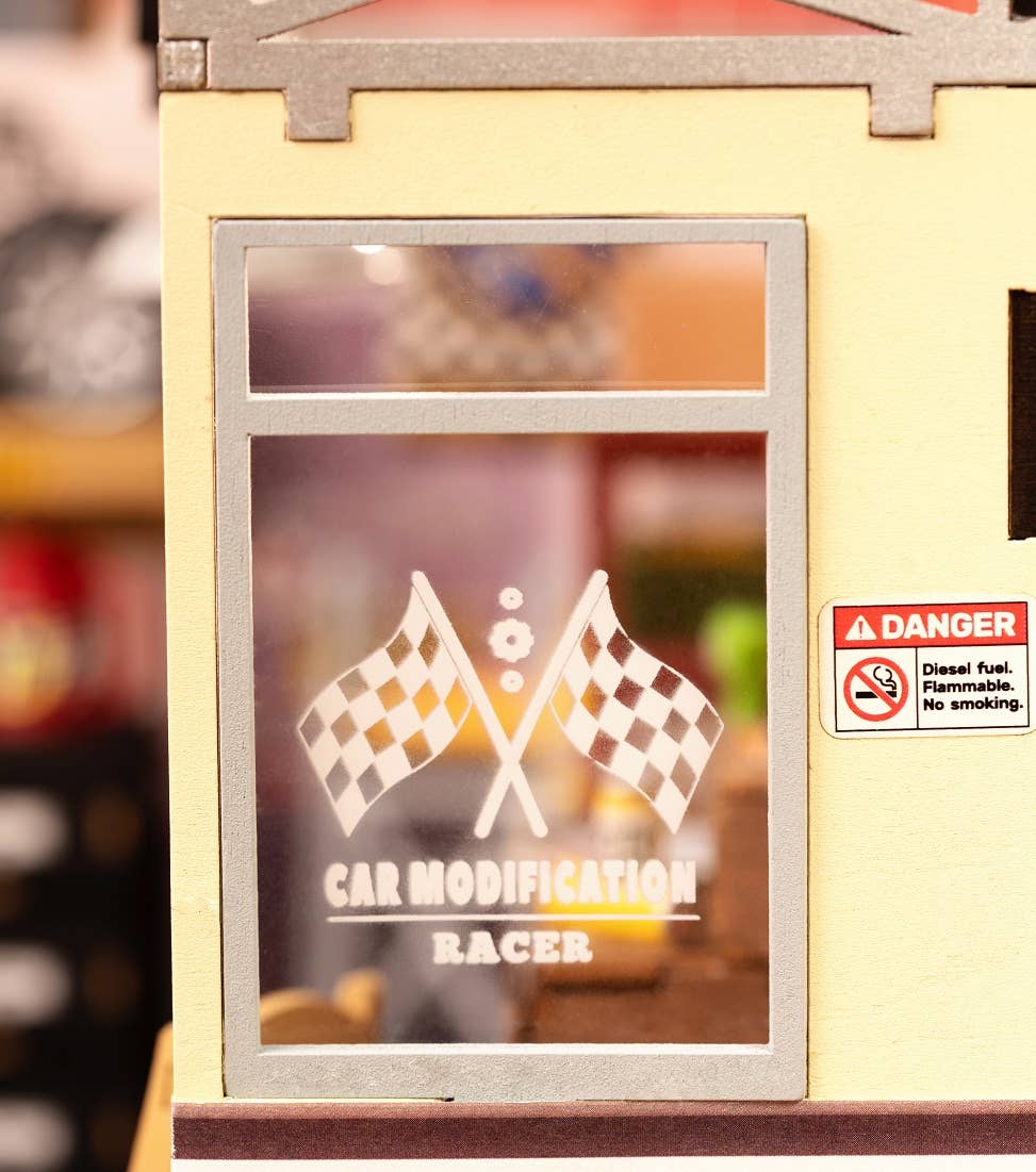 Rolife brings you what everybody wants in their home: the perfect garage workshop. Built with stunning accuracy, this miniature wonder captures your love for DIY with precisely crafted shelves, drawers, cabinets, boxes, wheels, hoses, tools, gloves, and accessories. We have details nailed down like the folding wet floor sign, the peg board, the toolbox, the watering can, the adhesives, the potted plant, the bricks, the classic chessboard floor, plus much more. The room is well-lit by an overhead LED lamp. Every space is optimized as is typical of the ideal home garage. The colors and textures depict a cheery and productive space where fantastic ideas become reality.