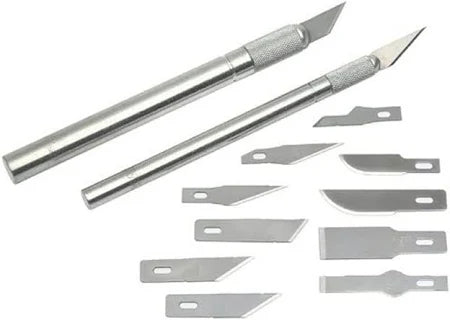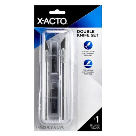 For a variety of light and medium duty cutting tasks. Includes No. 1 Precision knife and No. 2 medium weight knives. Contains two No. 11. Classic Fine Point Blades, two No. 24 Deburring Blade, and one each of No. 10 General Purpose Blade, No. 16 Scoring Blade, No. 17 Lightweight Chiseling Blade, No. 18 Heavyweight Wood Chiseling Blade, No. 19 Angled Wood Chiseling Blade, and No. 22 Large Curved Carving Blade. Clear plastic storage case. Carded. No. 5262