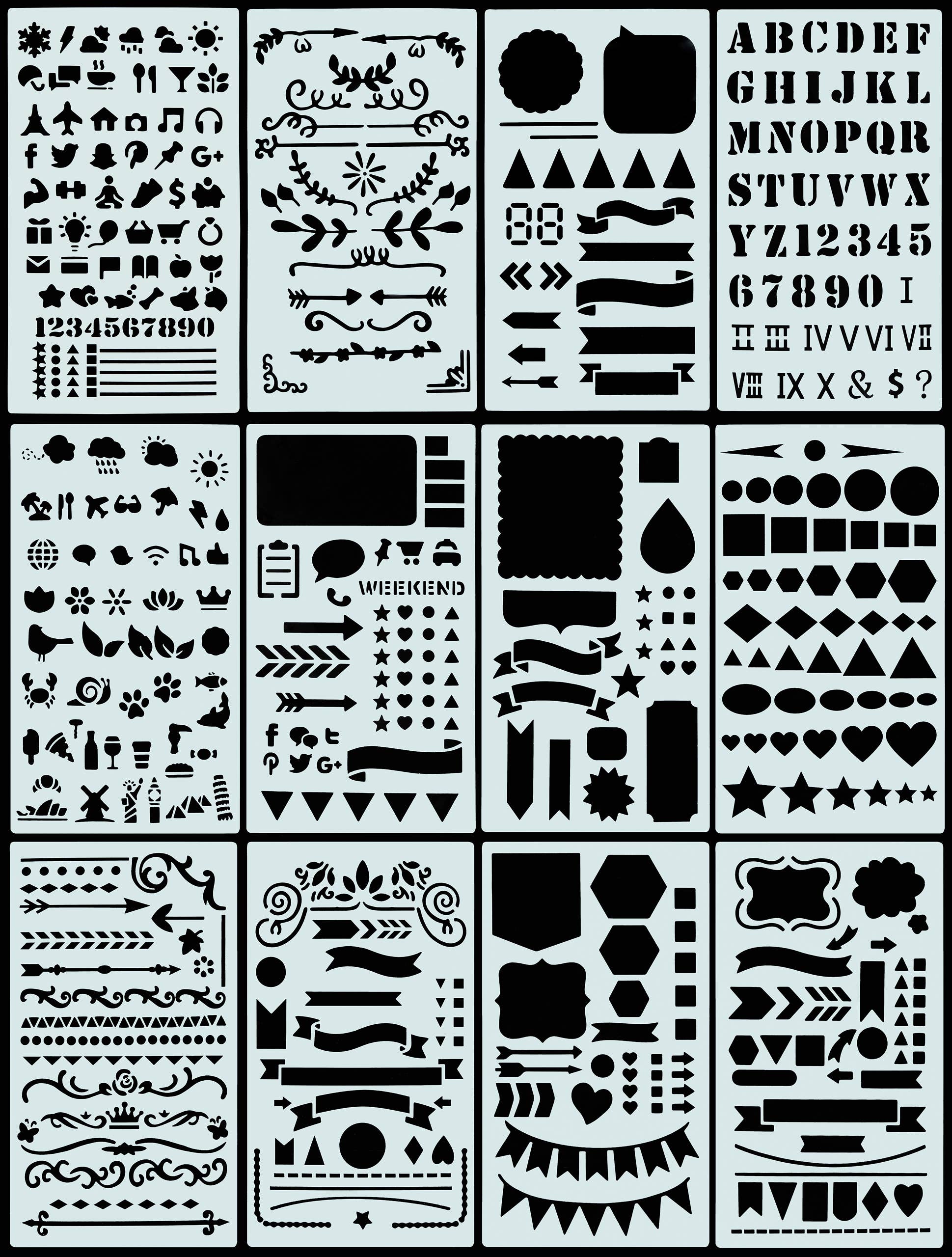 Here are more than 300 stencils to kick your dot journaling up a notch! Set includes 12 sheets with over 300 stencils for dot or bullet journaling, visual planning, scrapbooking, and more. Take your journal to the next level with icons, symbols, banners, letters, numbers, page dividers, and more! Perfect for any journal, calendar, or planner. Stencil set fits in the back pocket of Peter Pauper Press calendars and larger journals. Package measures 4-5/8'' wide x 7-1/2'' high.