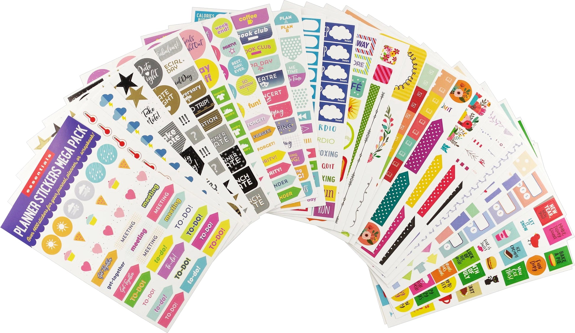 All-in-one set is packed with 30 sheets containing more than 1,400 different stickers! Just for you -- a hand-picked assortment of over 1,400 stickers from our bestselling planner sticker sets! Stay organized and keep track of it all -- appointments, chores, special days, holidays, exercise goals, weather forecasts, and so much more. This mega pack has you covered! Add style to your calendar or planner with these attractive and practical designs. It's a planner sticker extravaganza! Sticker set fits in the back pockets of Peter Pauper Press engagement calendars and journals. Package measures 4'' wide x 7-1/2'' high.