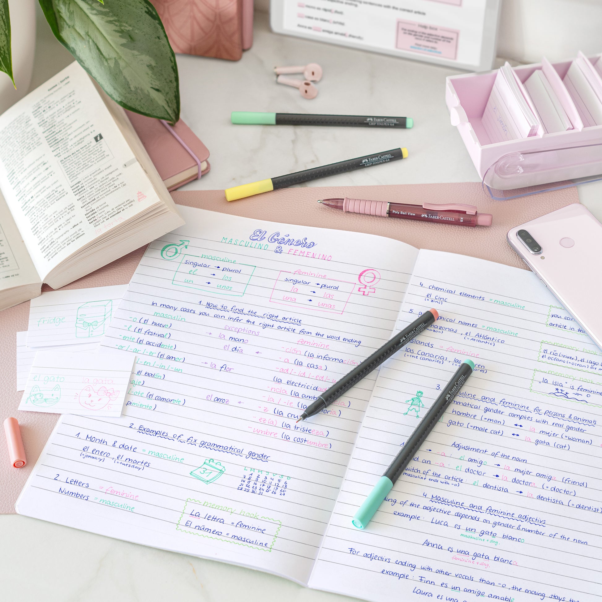 Grip Finepen, 0.4, set of 5 Ideal for thin lines and shading: the finepen features an ergonomic triangular barrel that automatically promotes a tripod grasp and ensures optimum writing comfort. Product details The Finepen with ink based on food dyes Ink based on food dyes Long metal-framed tip Line width: 0.4 mm Ideally suitable for drawing with ruler and template With patented grip zone for a secure, non-slip grip Ergonomic triangular shape Brilliant colours Washes out of most fabrics Suitable for right- and left-handers Recyclable cardboard packaging Includes: Pastel shades Yellow, Pink, Orange, Green and Turquoise.