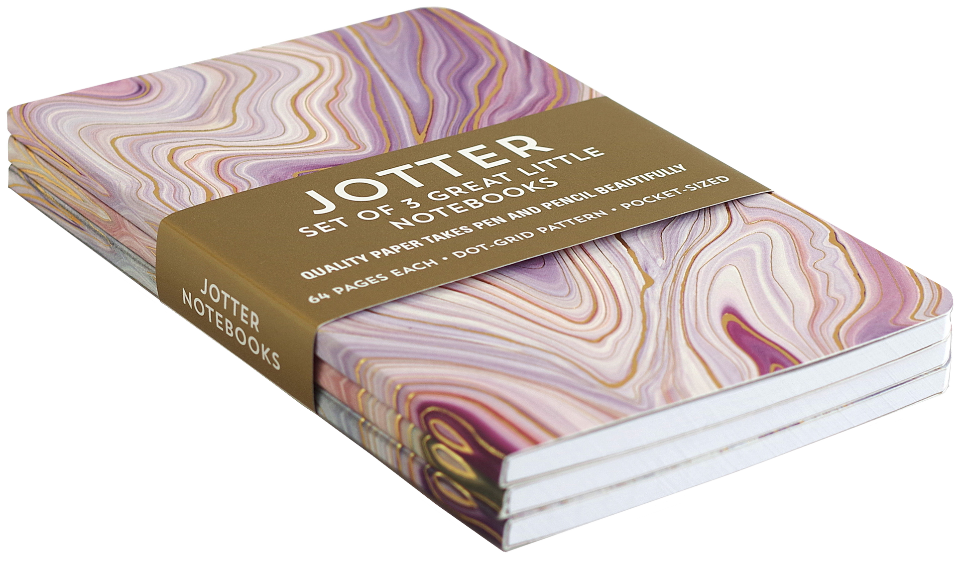 Set of 3 attractive little notebooks to go! Set includes 3 mini notebooks in violet, blue, and coral agate. (Agate is a variegated form of quartz.) The cover of each notebook is embellished with gold foil. The interior of each notebook features a dot-grid pattern for maximum flexibility of use. Premium 100 gsm paper takes pen and pencil beautifully. Paper is acid-free and of archival quality. Each mini notebook measures 3-1/2'' wide x 5-1/2'' high. Pocket-sized to go anywhere! Purse, glove box, backpack, desk drawer, you name it! 64 pages each. Set comes shrink-wrapped.
