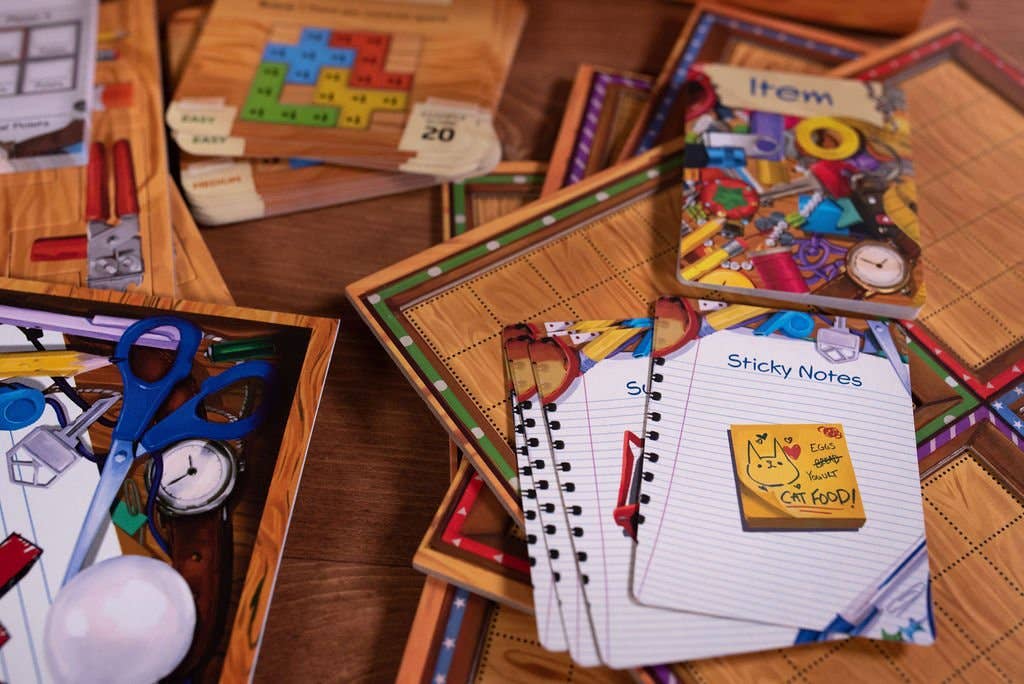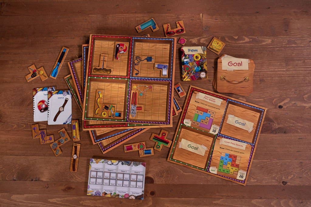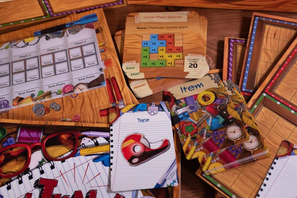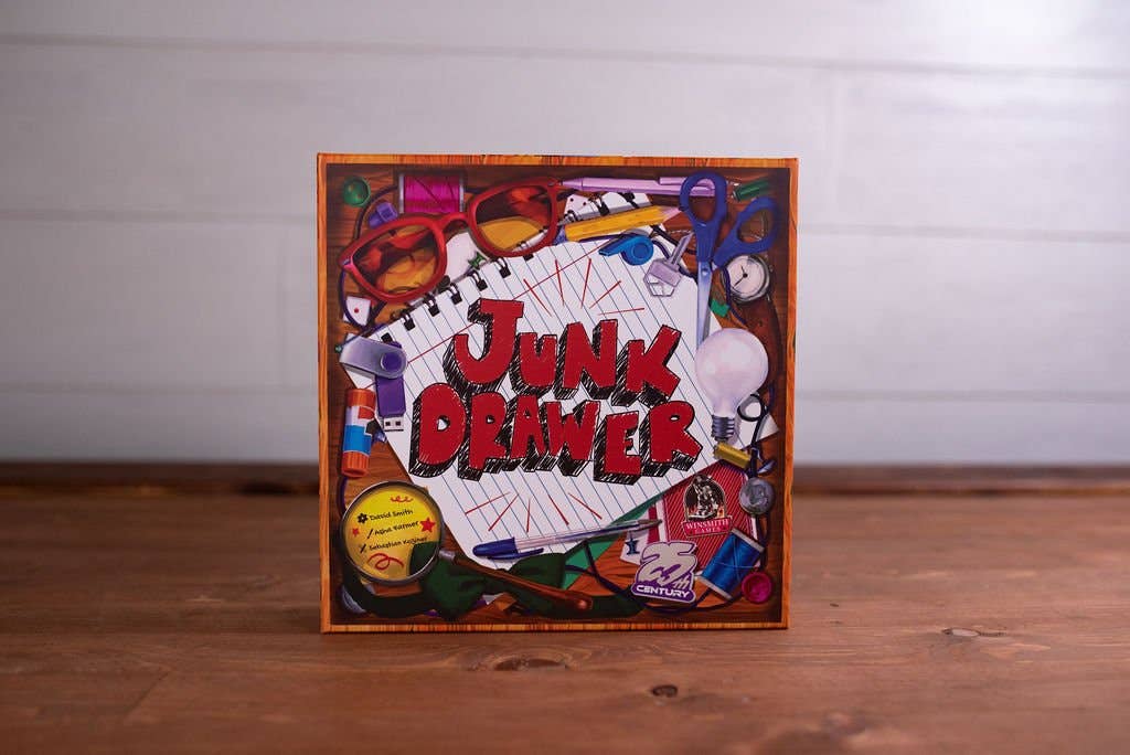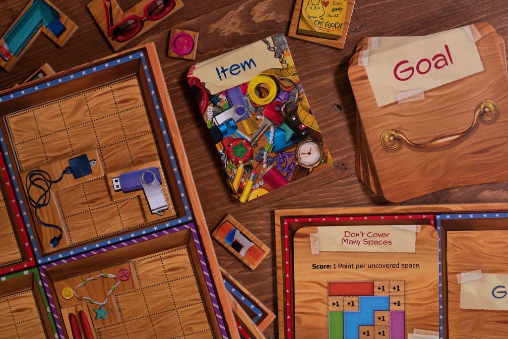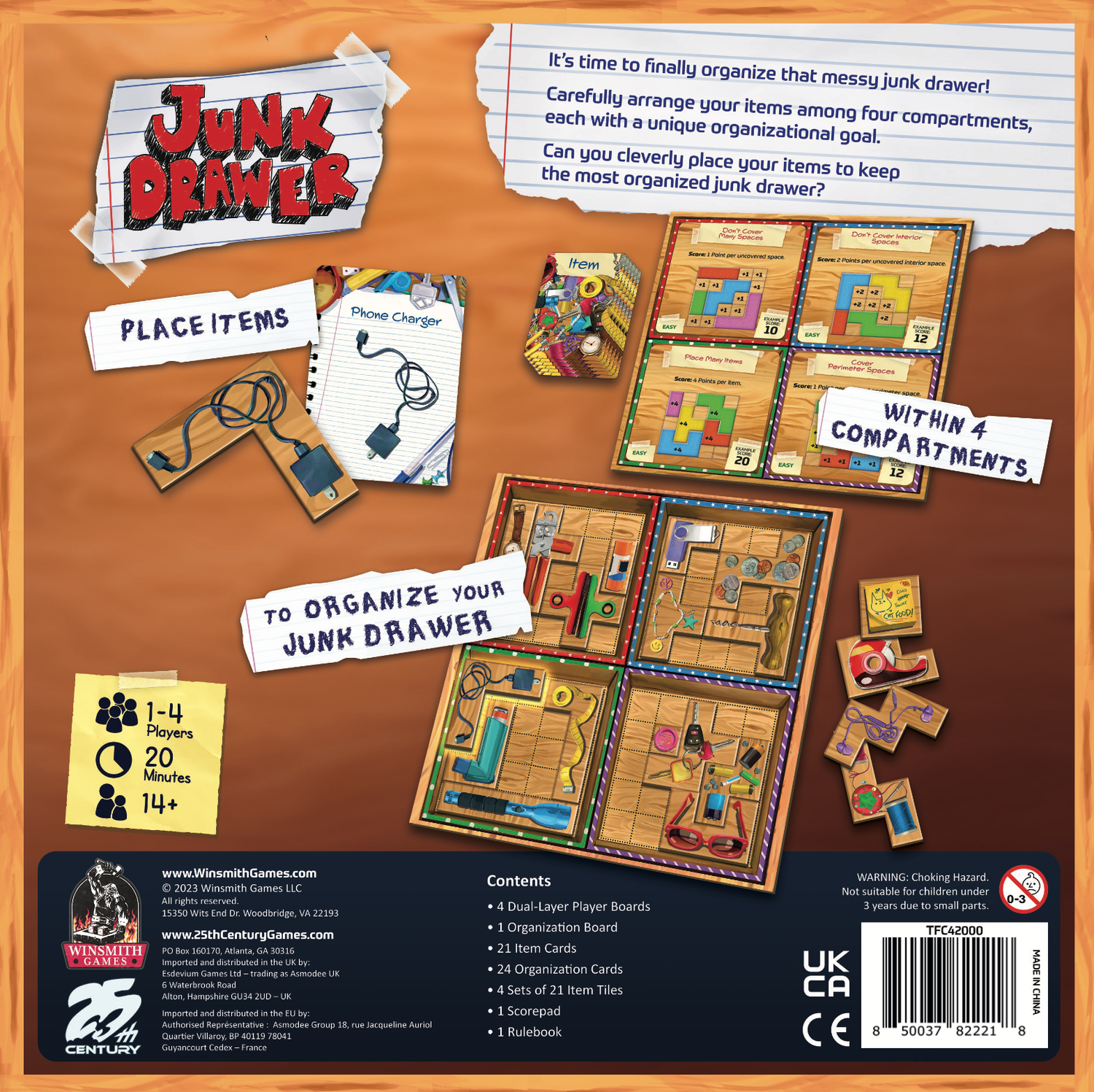 Players organize their junk drawer by carefully arranging various shaped items within the four sections. Each section has a unique organizational goal and each round, players must place one item in each section. At the end of the game, each section earns points based on how well they are organized. The player with the highest score wins.