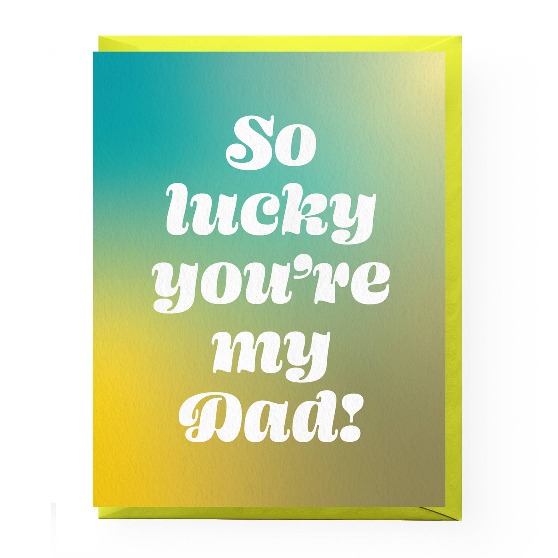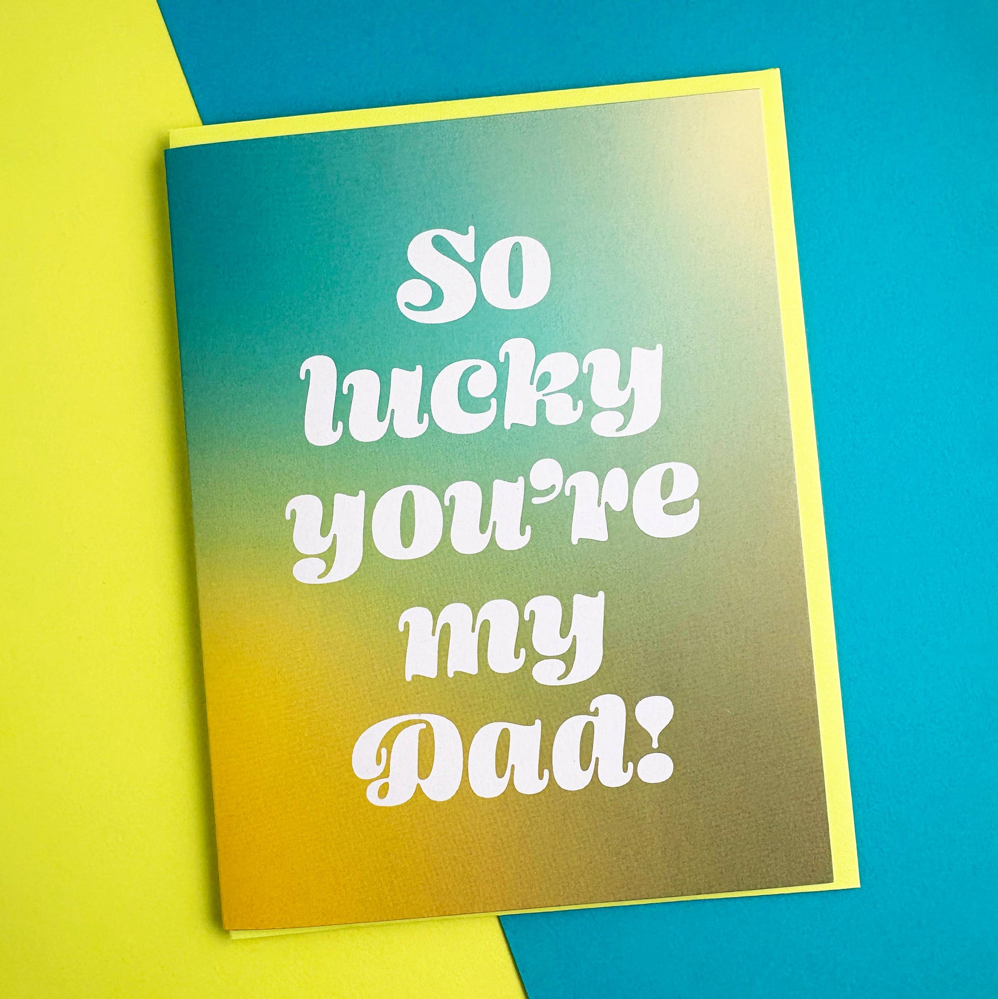 Fathers Day card reads "So lucky you're my dad" against a vibrant teal, yellow and olive gradient.