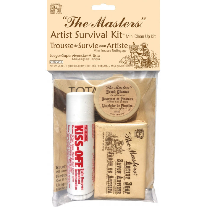“The Masters” Mini Clean Up Kit is a handy take along kit with all the products needed for safe and easy clean up of inks, dyes, paints, and more. The kit contains Kiss-Off Stain Remover, “The Masters” Hand Soap, and “The Masters” Brush Cleaner.