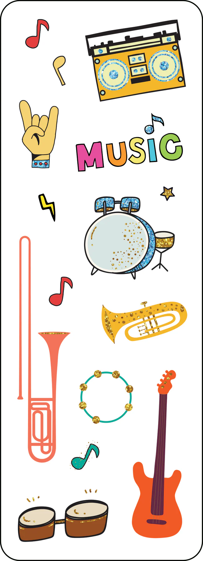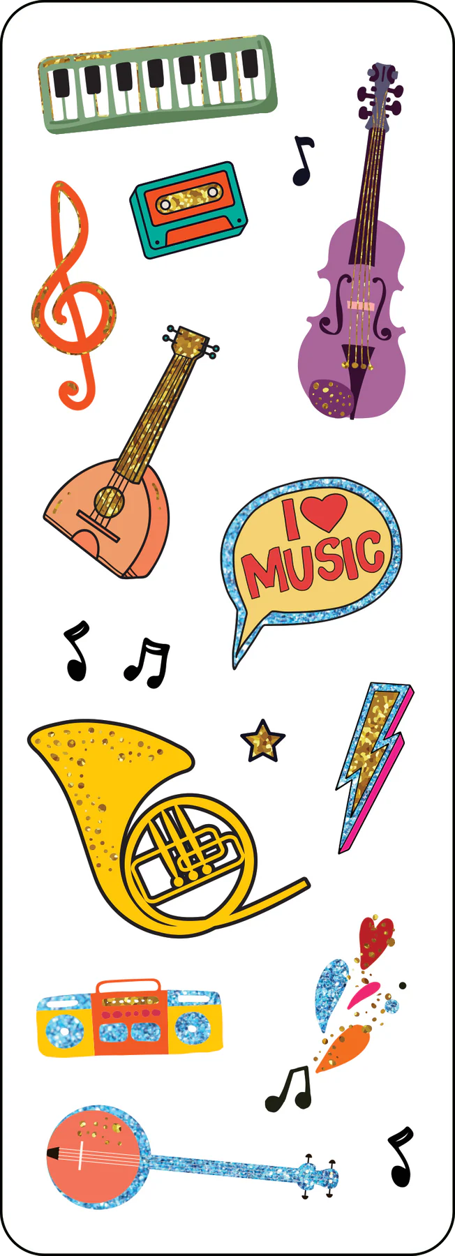 • Stickers feature drums, guitars, keyboards, musical notes, headphones, microphones, and more -- over 7 dozen different stickers in all!
