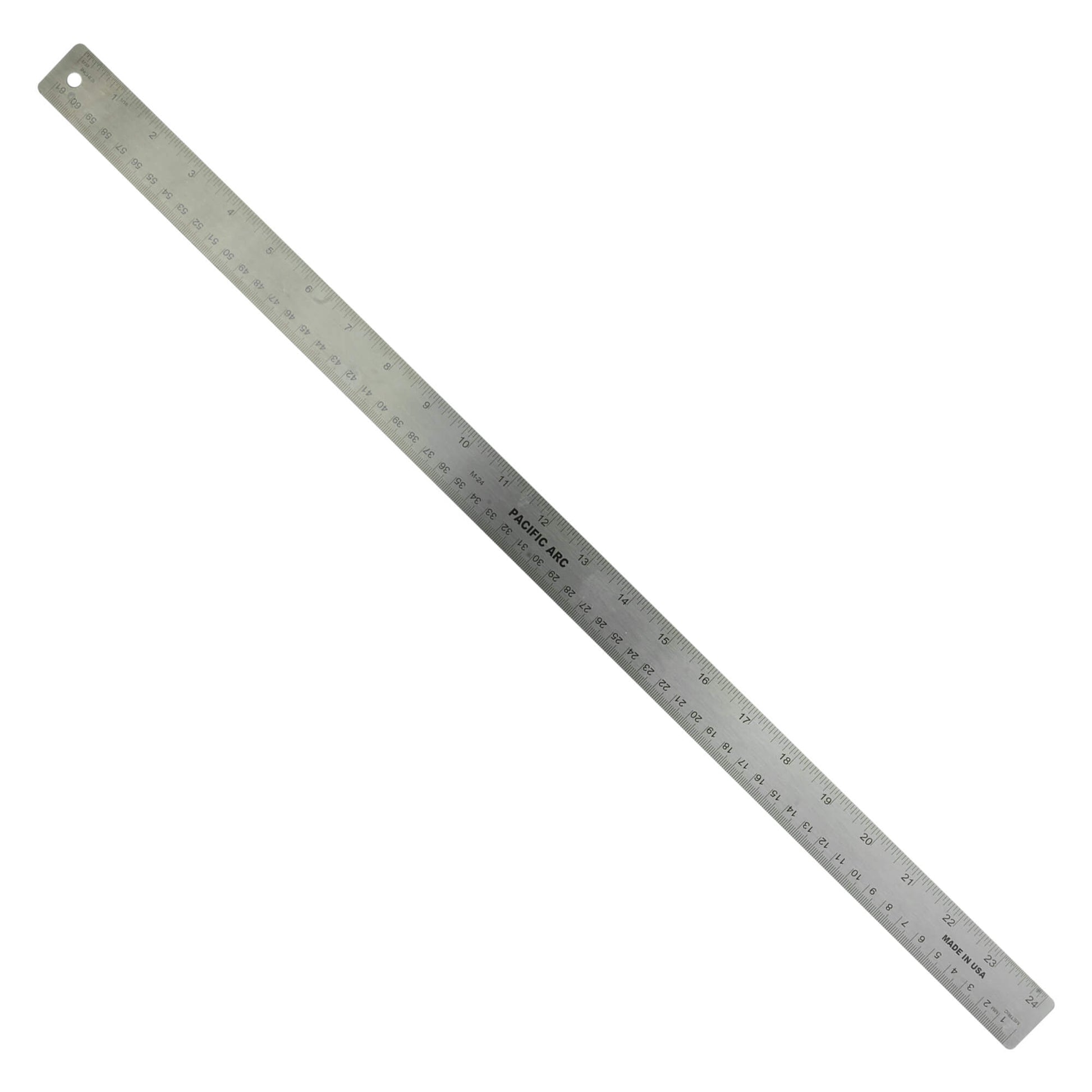 1 1/8 in. wide. Top edge graduated in inches, bottom edge graduated in millimeters. Cork on back provides non-slip grip when working on papers.