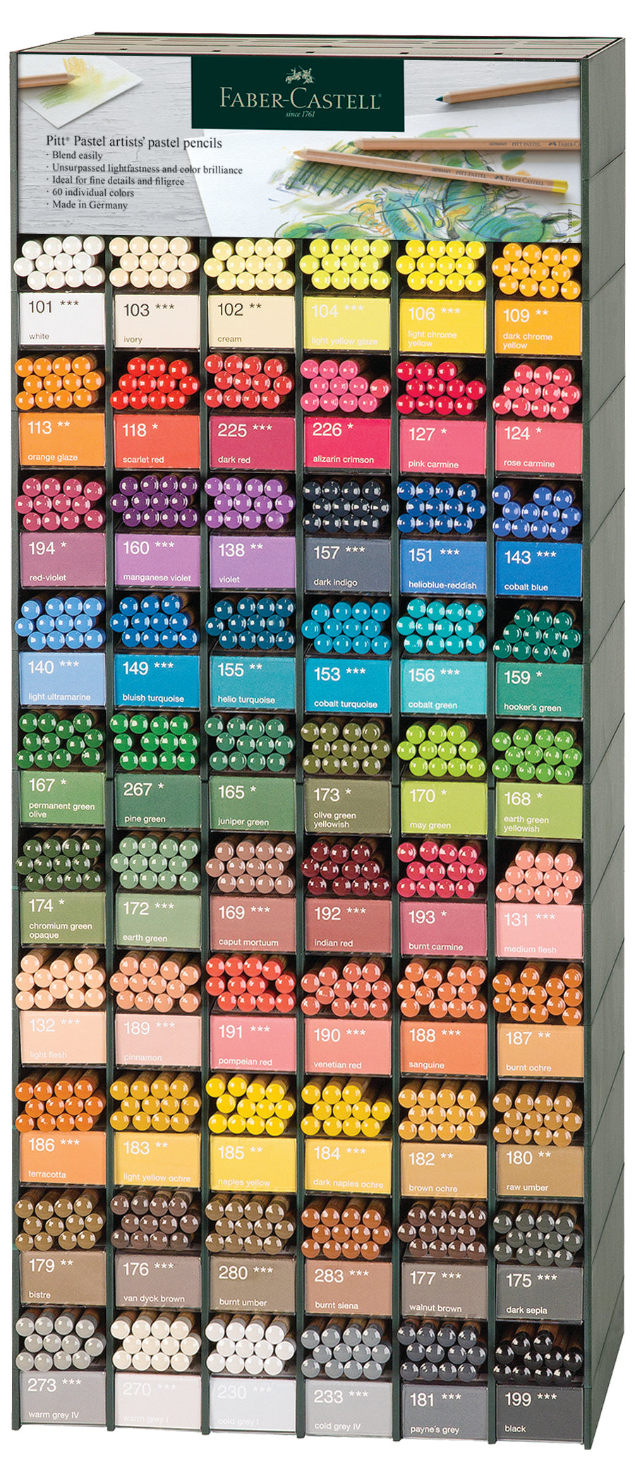 The Pitt pastel pencils contain a high level of pigment, but are wax and oil free, and are perfectly suited for fine details in pastels. Just like the Polychromos pastel crayons they can be easily smudged to create fine colour transitions and perfectly complement the pastel crayons. Only minimal fixing is required, ensuring that the pastel drawings retain their vividness of colour.