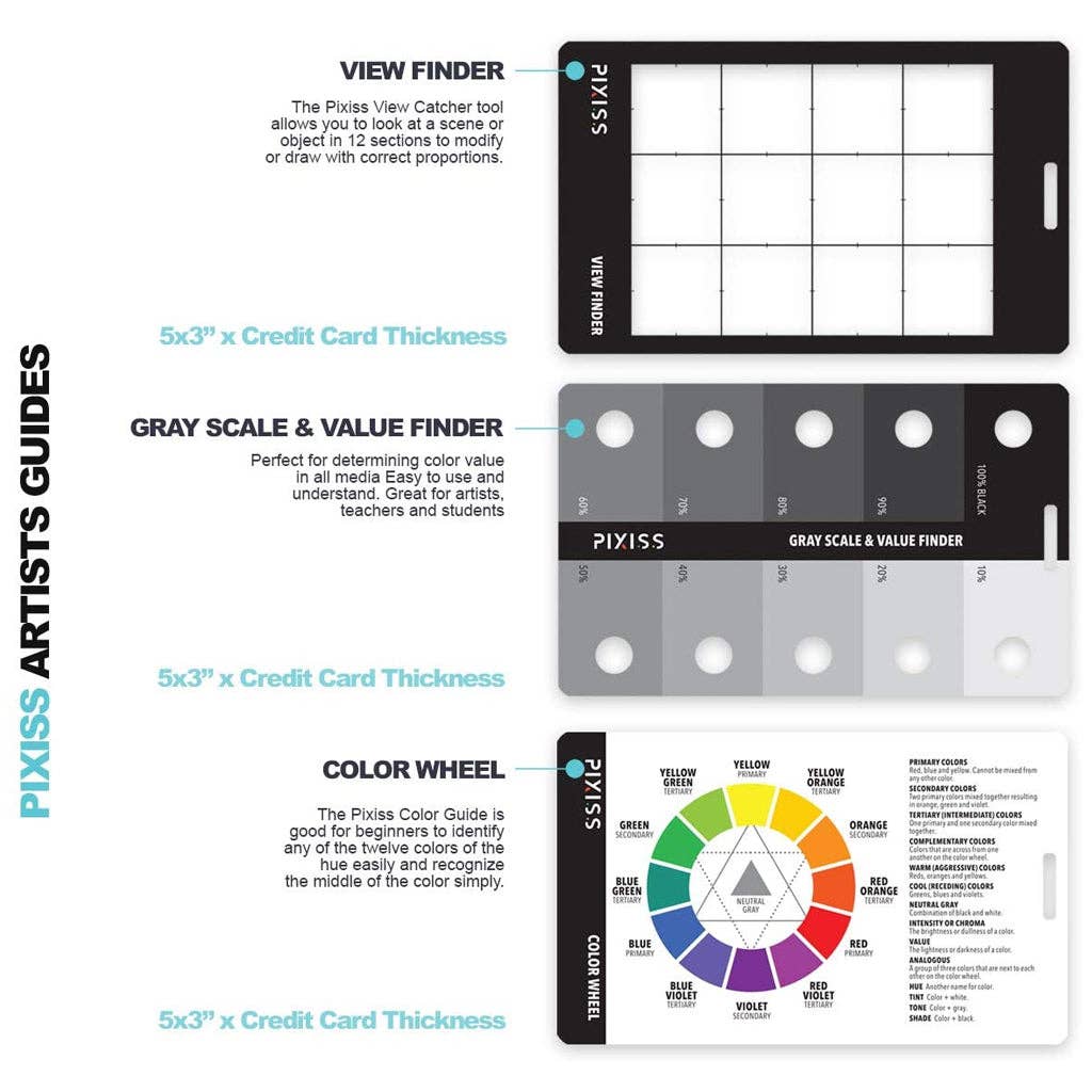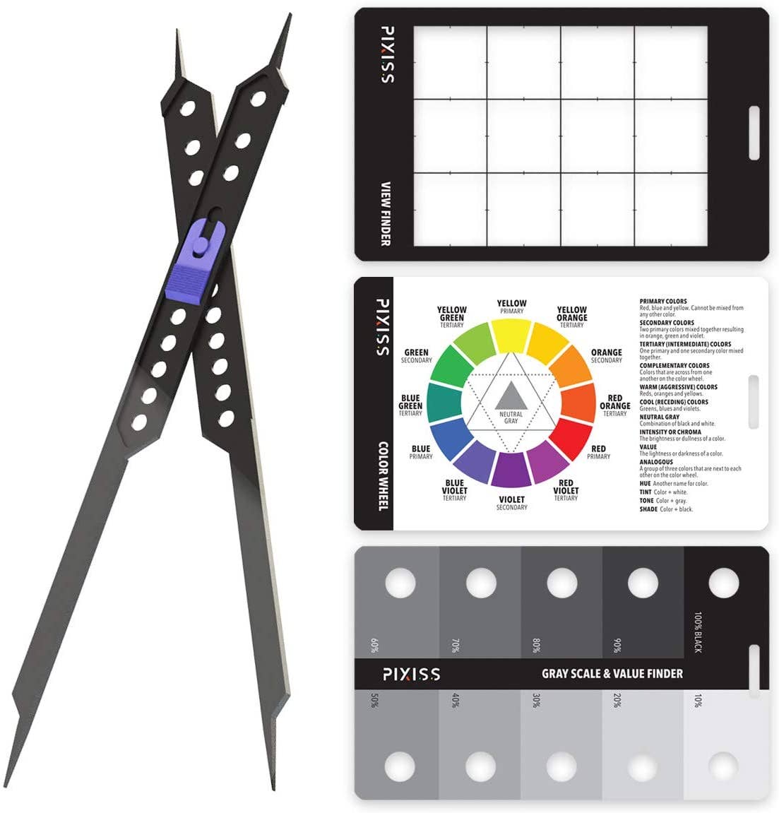 The Pixiss Proportional Scale Divider tool can be used to transfer subject matter onto your canvas or paper while keeping the proportions. Easy to use. Increase, decrease or measure the size of a subject to draw. The Pixiss Artist's View Catcher (often called a view finder or viewfinder) allows you to look at a scene or object in twelve sections to modify or draw with correct proportions. 5x3". Determine color values and intensities with the Pixiss grey scale & value finder. This artist viewfinder is 5x3" size.