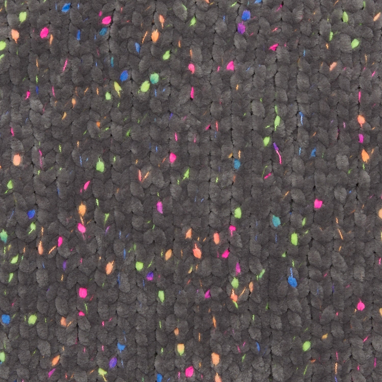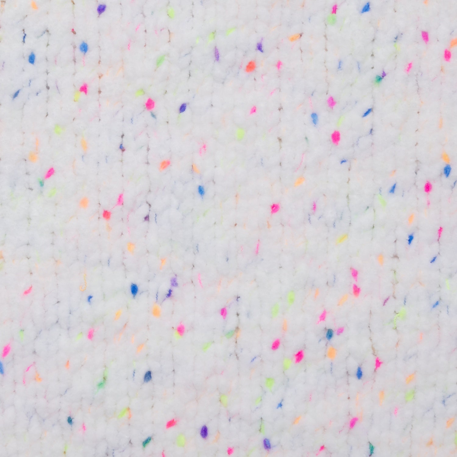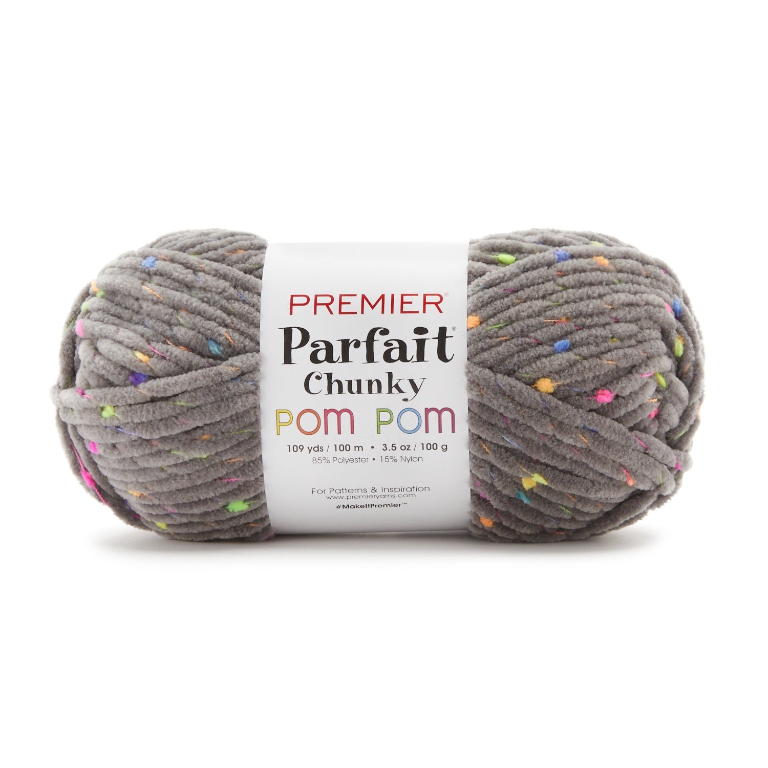 Our popular Parfait Chunky yarn now comes with bright festive Pom Poms. It is an incredibly soft chenille yarn with a nylon Pom Pom wrap that is sure to add pizzazz to all your creations. It is a Super Bulky weight for quick projects that can be used on its own or combined with Parfait Chunky solids to add a bit more fun to your project. It is the perfect yarn for amigurumi, blankets and accessories.