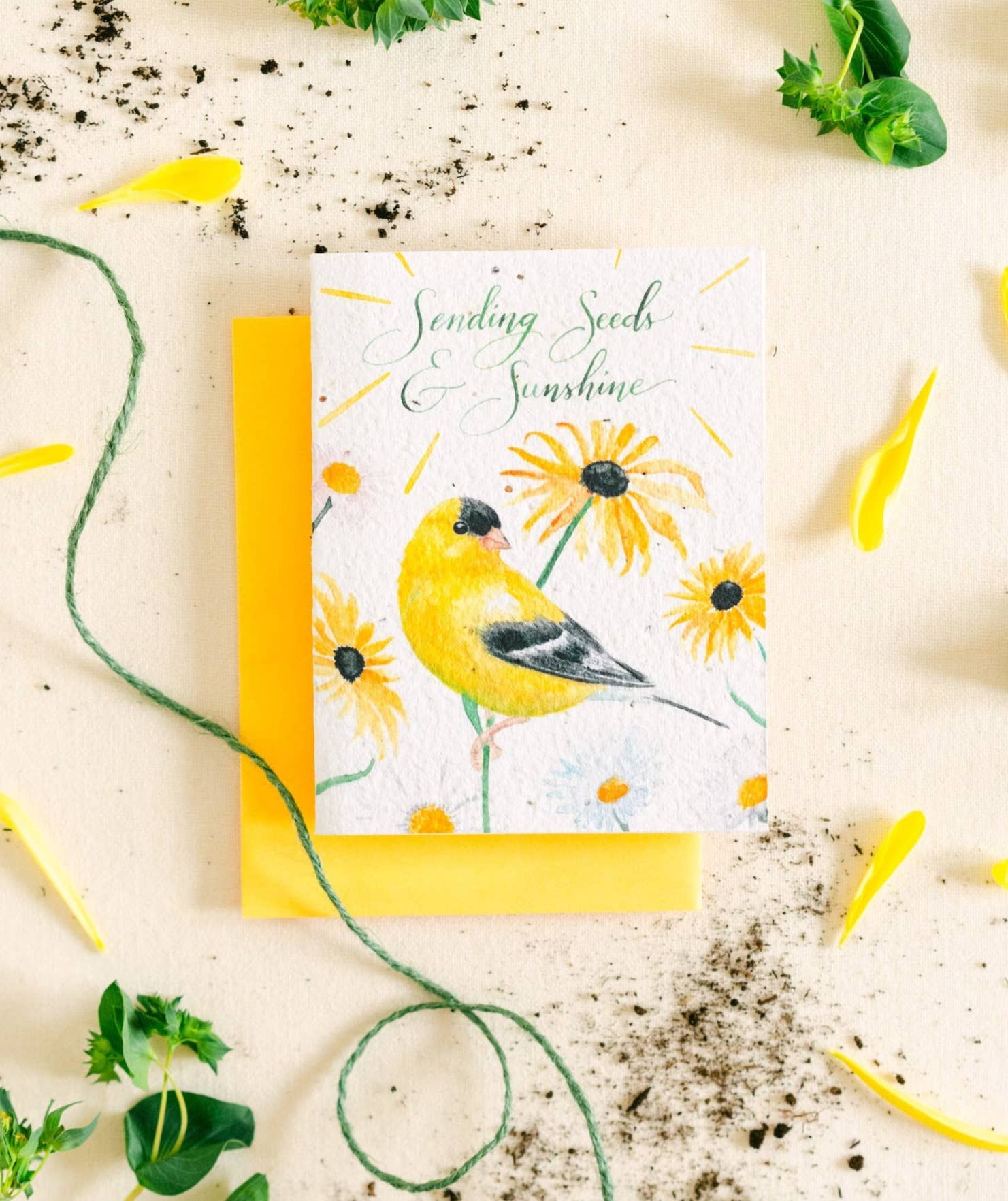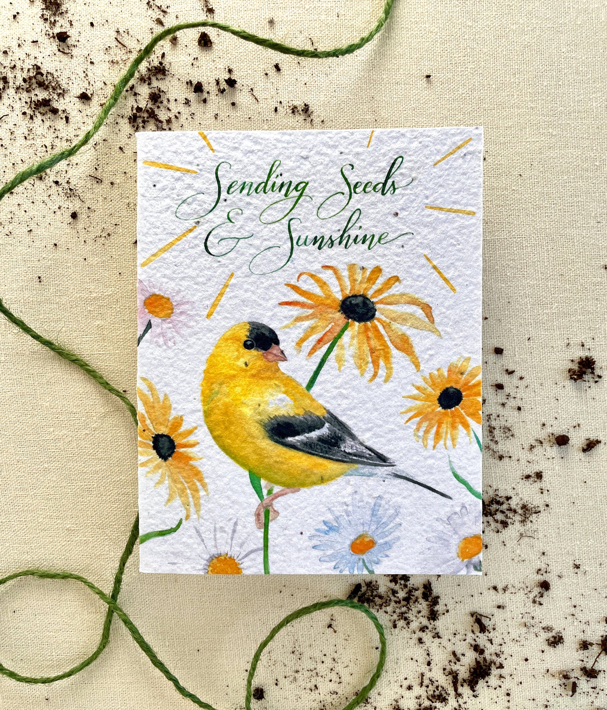 "Sending Seeds and Sunshine" yellow plantable wildflower seed card features a sunny goldfinch, black eyed susans, and daisies to bring light and flowers to anyone's day!