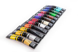Set contains 22ml tubes of: Primary Yellow, Cadmium Yellow Medium Hue, Cadmium Yellow Deep Hue, Cadmium Orange Hue, Cadmium Red Medium Hue, Naphthol Crimson, Cadmium Red Deep Hue, Medium Magenta, Dioxazine Purple, Ultramarine Blue, Phthalocyanine Blue(Green Shade), Primary Blue, Light Blue Permanent, Bright Aqua Green, Hooker's Green Hue Permanent, Light Green Permanent, Burnt Sienna, Burnt Umber, Mars Black, Ivory Black, Unbleached Titanium, Titanium White, Silver, Gold.