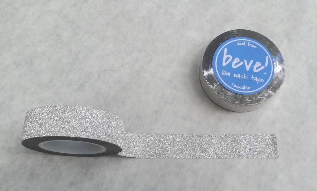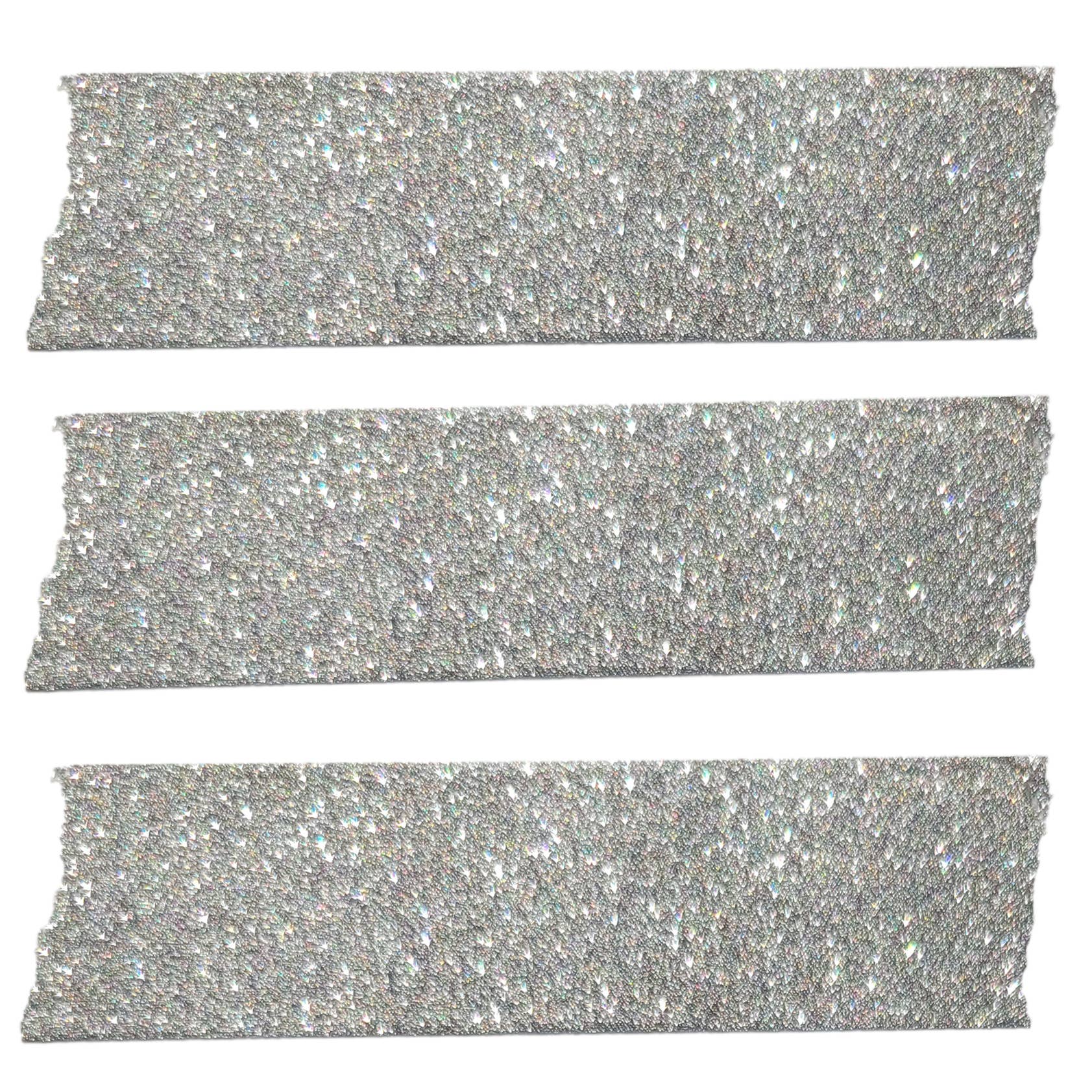 Sparkly silver glitter tape. No shedding, no mess. This fun tape is able to be torn by hand and it is repositionable, so it is great for crafting and scrapbooking.