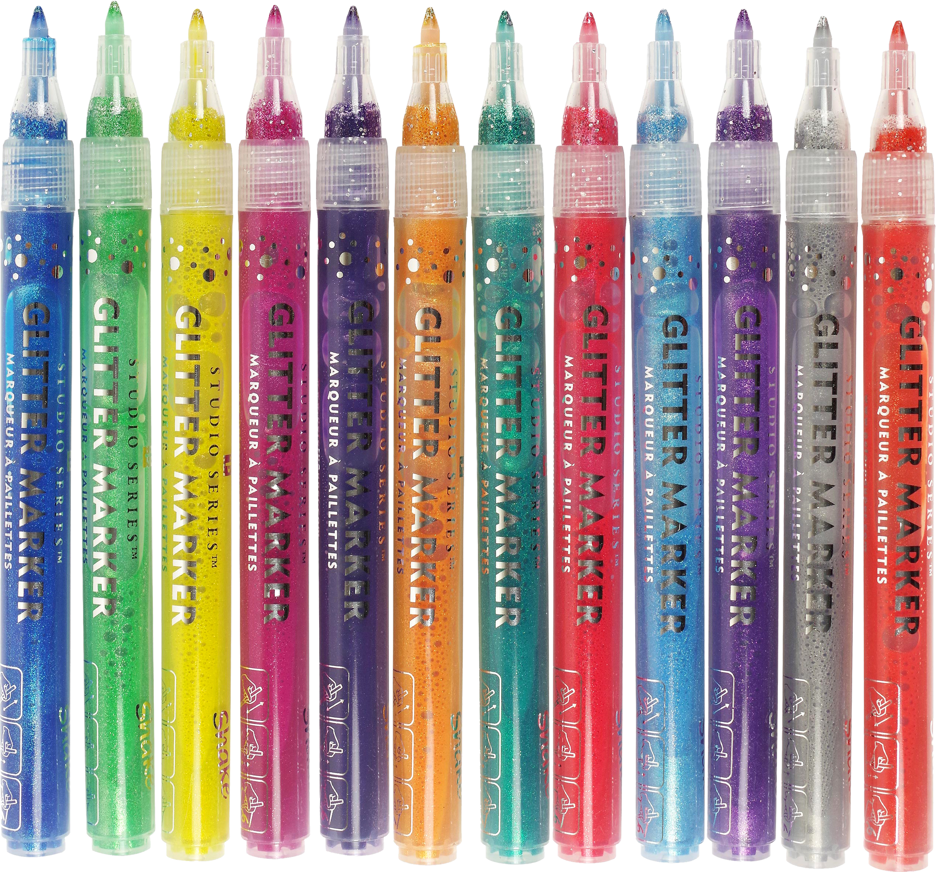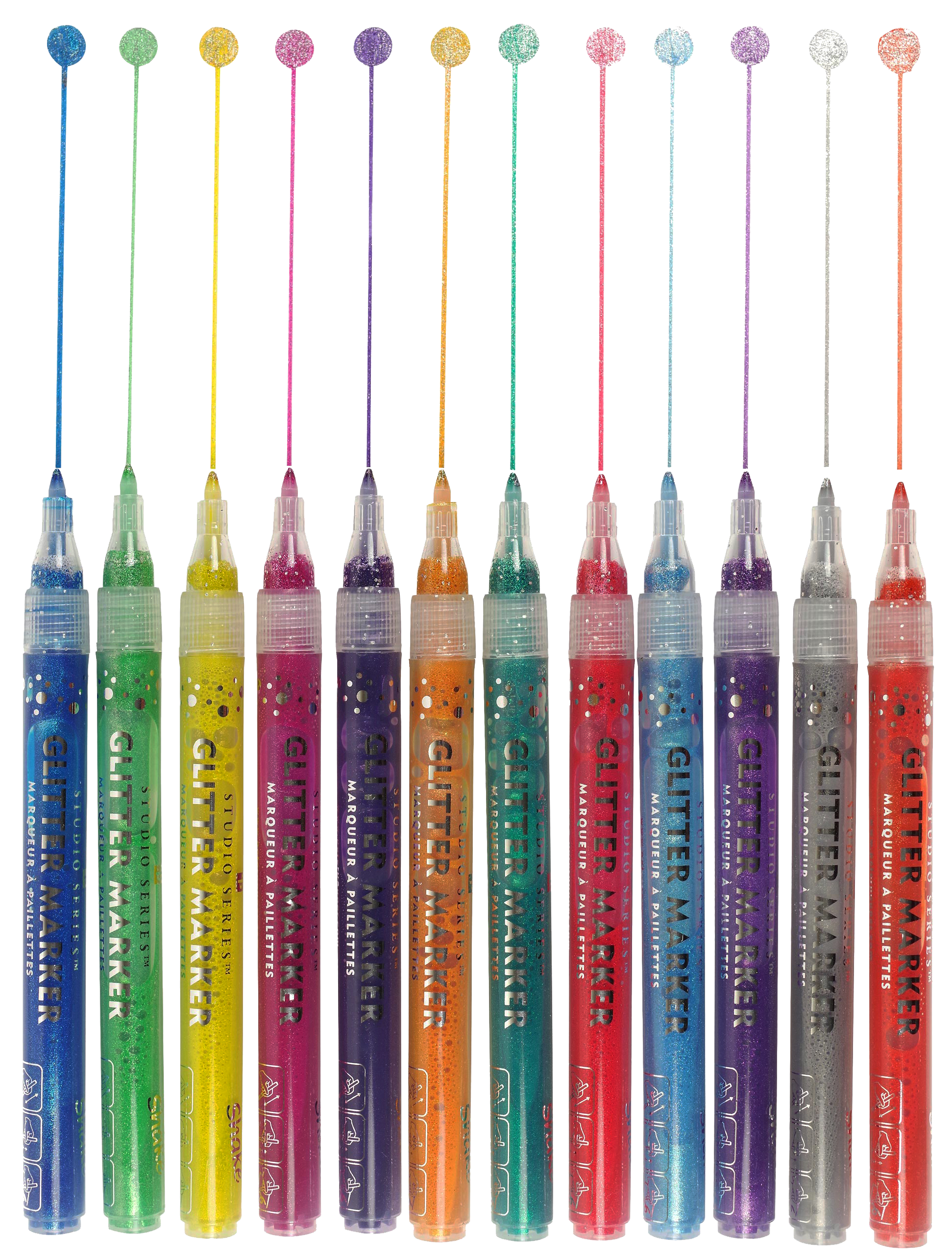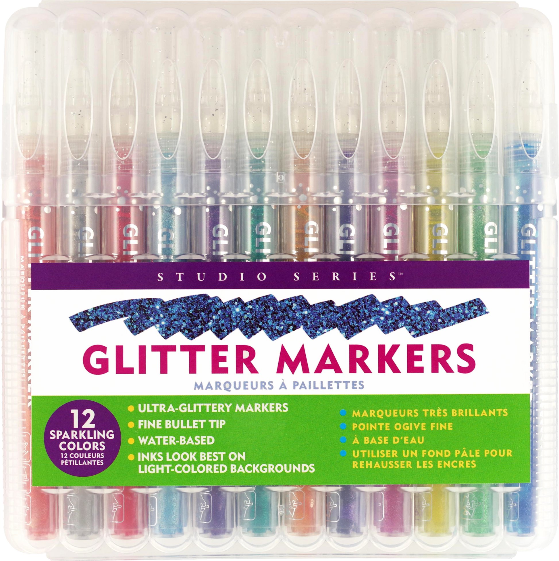 Add sparkle to your art projects with Glitter Markers in 12 dazzling colors! Ultra-glittery markers! Fine 0.7mm bullet tips. Water-based ink. 12 vibrant colors. Inks look best on light-colored backgrounds. TO START INK FLOW: Gently shake marker. Uncap. Press tip down against a surface until ink flows to tip, then draw. Recap marker right away when finished. Each marker measures 5-1/4'' in length. Set comes in a sturdy plastic storage case that keeps markers safe and organized on the go. Case measures 6'' square.