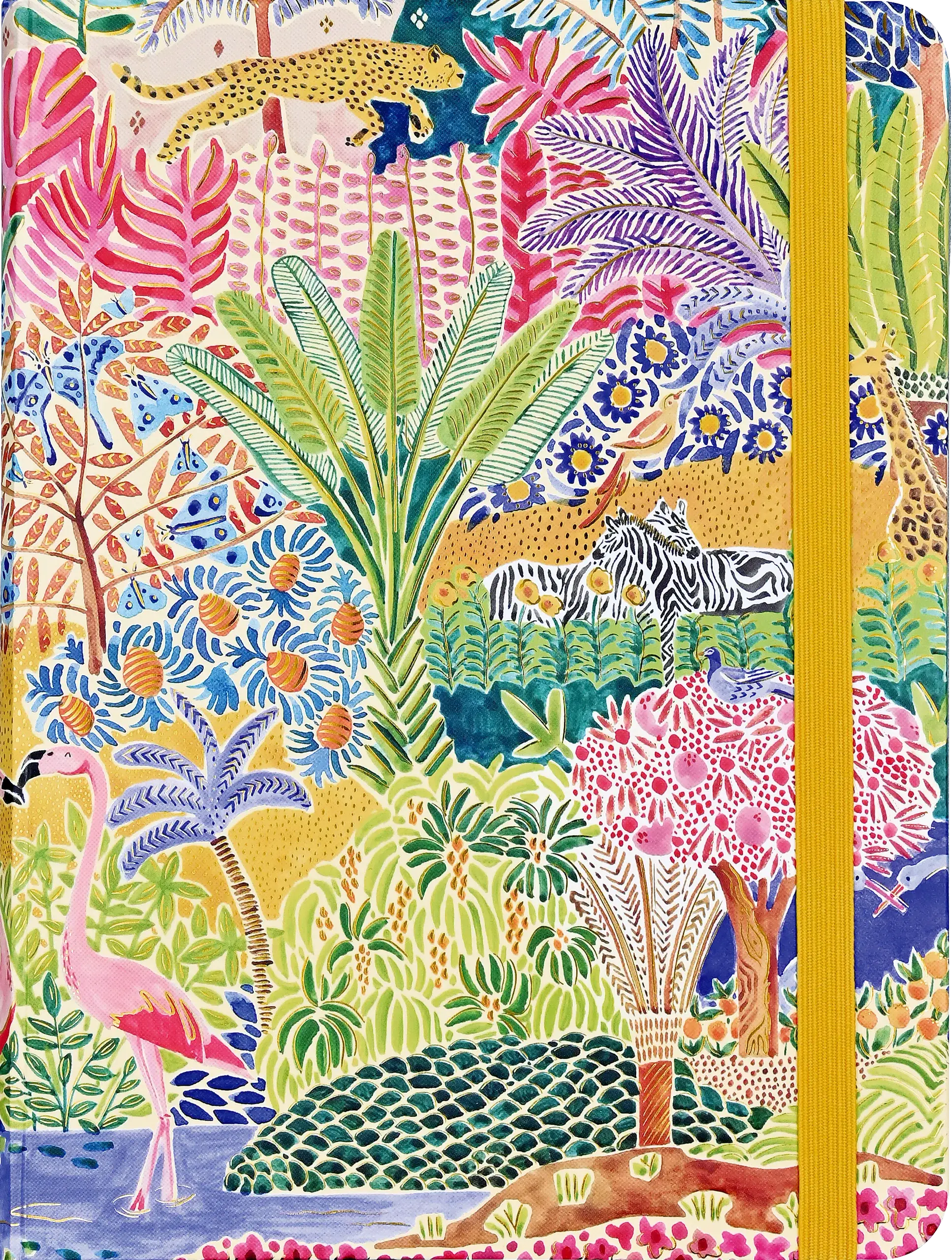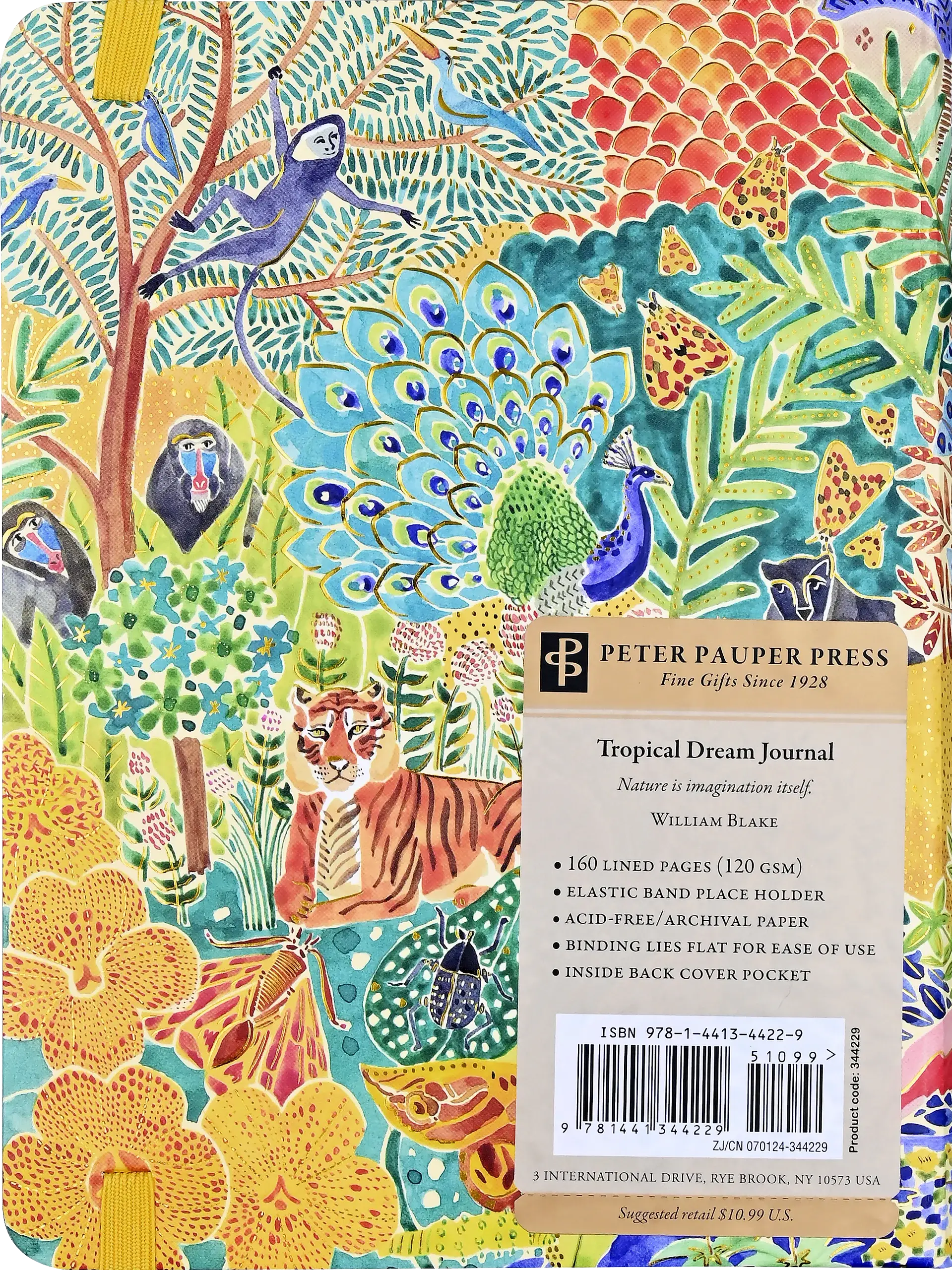 Immerse your musings within the pages of this stunning journal! Its cover depicts an exotic coastal world filled with lush flora, wonderful fauna, and a blue lagoon. Can you find the peacock, the giraffe, and the mandrills? Design is embossed and embellished with hand-selected touches of gold foil. Inside, crisp journaling pages provide plenty of space for personal reflection, sketching, or jotting down favorite quotations or poems. Premium 120 gsm paper takes pen or pencil beautifully. Paper is acid free and of archival quality, preserving your writing for years to come. An inside back cover pocket expands to hold notes, cards, mementos, and more. The matching elastic closure secures your journal. Interior endsheets complement the overall design. Durable hardcover binding. Journal measures 6-1/4'' wide x 8-1/4'' high. 160 pages. The perfect companion for capturing your thoughts and