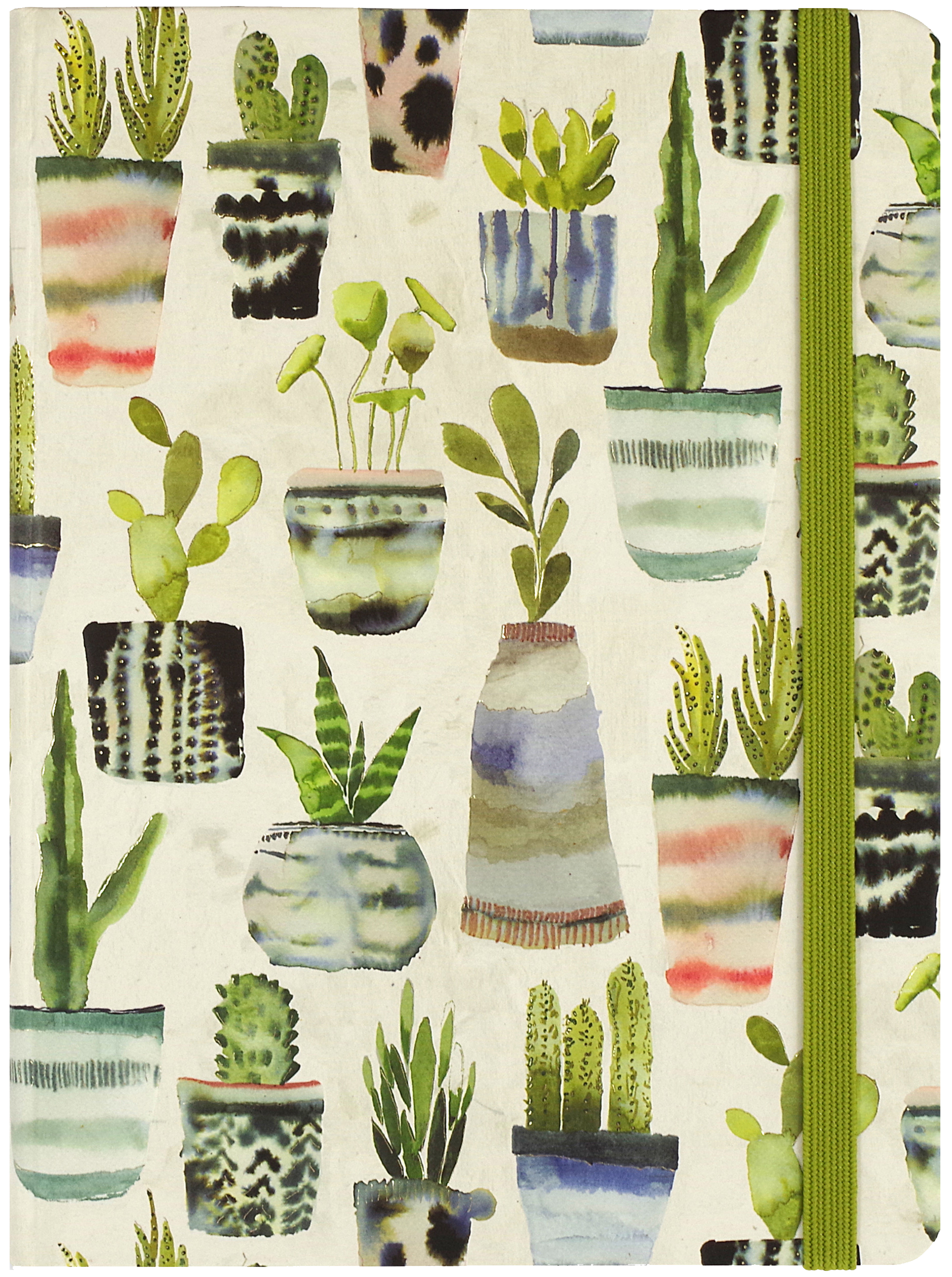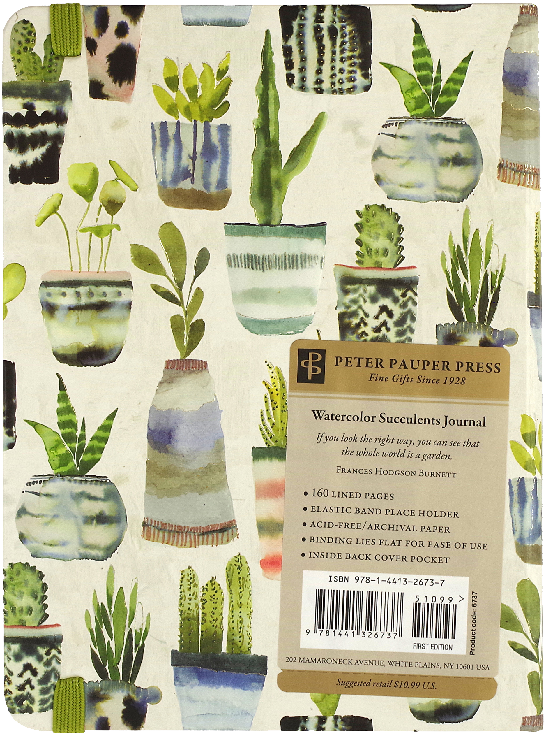 Cultivate your writing within the pages of this inviting journal! Crisp writing pages are perfect for personal reflections, sketching, or for recording favorite quotations or poems. Premium 120 gsm paper takes pen or pencil beautifully. Paper is acid free and of archival quality. Light gray lines subtly guide your writing. An inside back cover pocket expands to hold notes, cards, mementos, and more. The matching elastic closure secures your journal. Cover design depicts a variety of succulent plants in decorative containers, in greens, blues, grays, and coral. Touches of gold foil add gleaming detail. Interior endsheets complement the design. Durable hardcover binding. Journal measures 6-1/4'' wide x 8-1/4'' high. 160 pages.